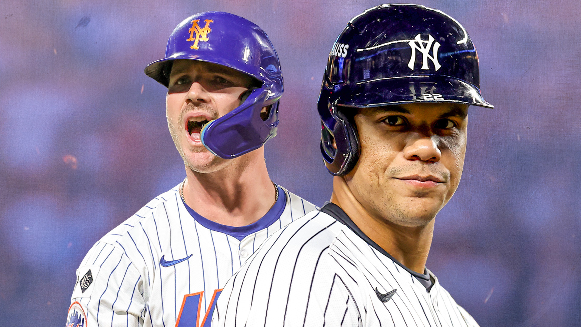 Aug 21, 2024; Bronx, New York, USA; New York Yankees center fielder Aaron Judge (99) celebrates with right fielder Juan Soto (22) after hitting a two run home run in the third inning against the Cleveland Guardians at Yankee Stadium. / Wendell Cruz-USA TODAY Sports