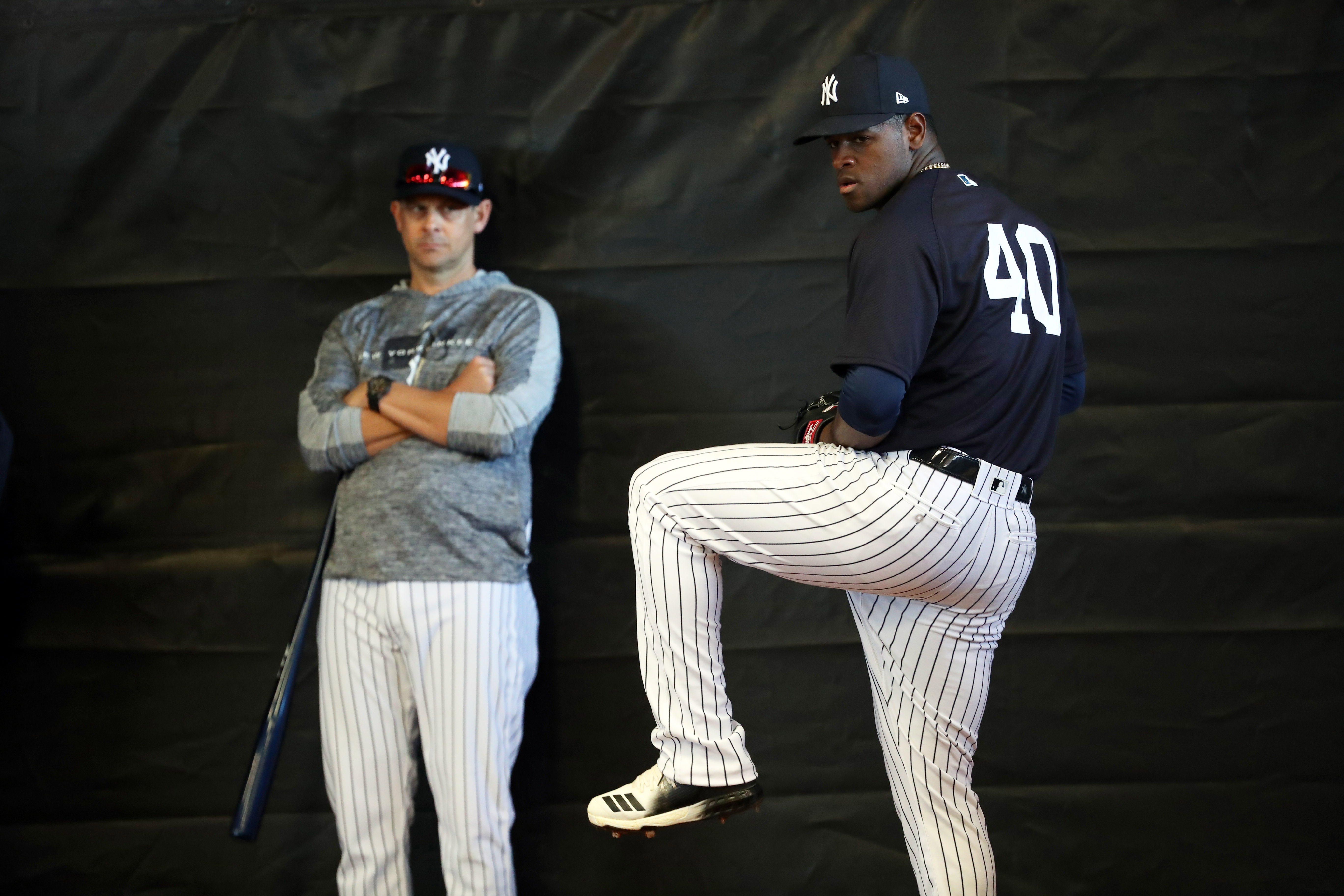 Feb 14, 2019; Tampa, FL, USA;New York Yankees starting pitcher Luis Severino (40) throws a bullpen session as manager Aaron Boone (17) looks on during spring training at George M. Steinbrenner Field. Mandatory Credit: Kim Klement-USA TODAY Sports / Kim Klement