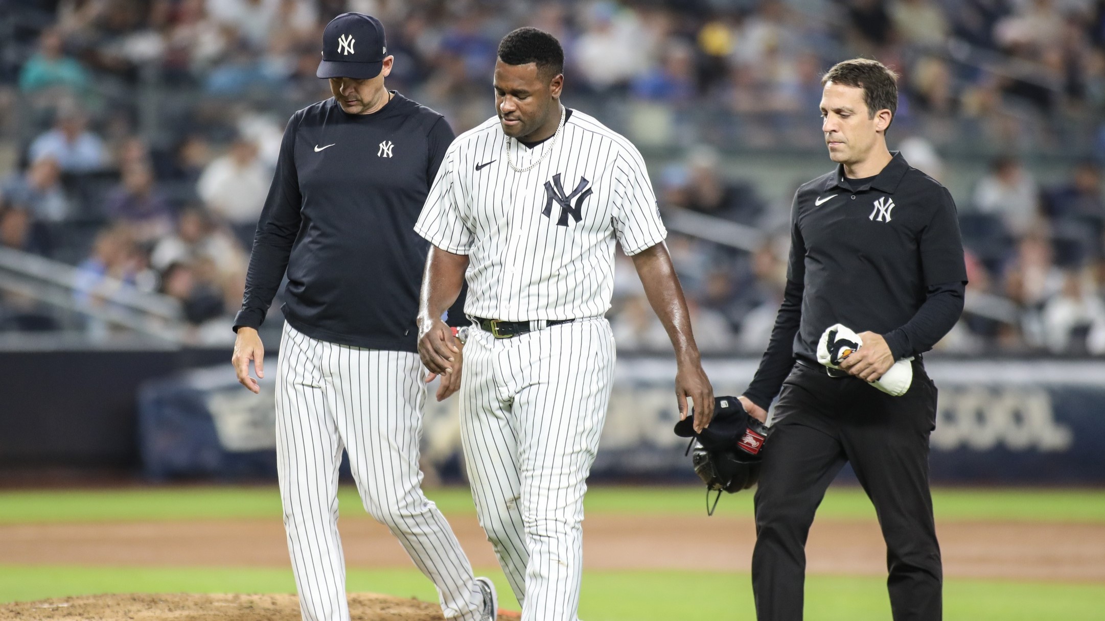 Sep 8, 2023; Bronx, New York, USA; New York Yankees starting pitcher Luis Severino (40) walks off the field with manager Aaron Boone (17) after getting injured in the fifth inning against the Milwaukee Brewers at Yankee Stadium. / Wendell Cruz-USA TODAY Sports