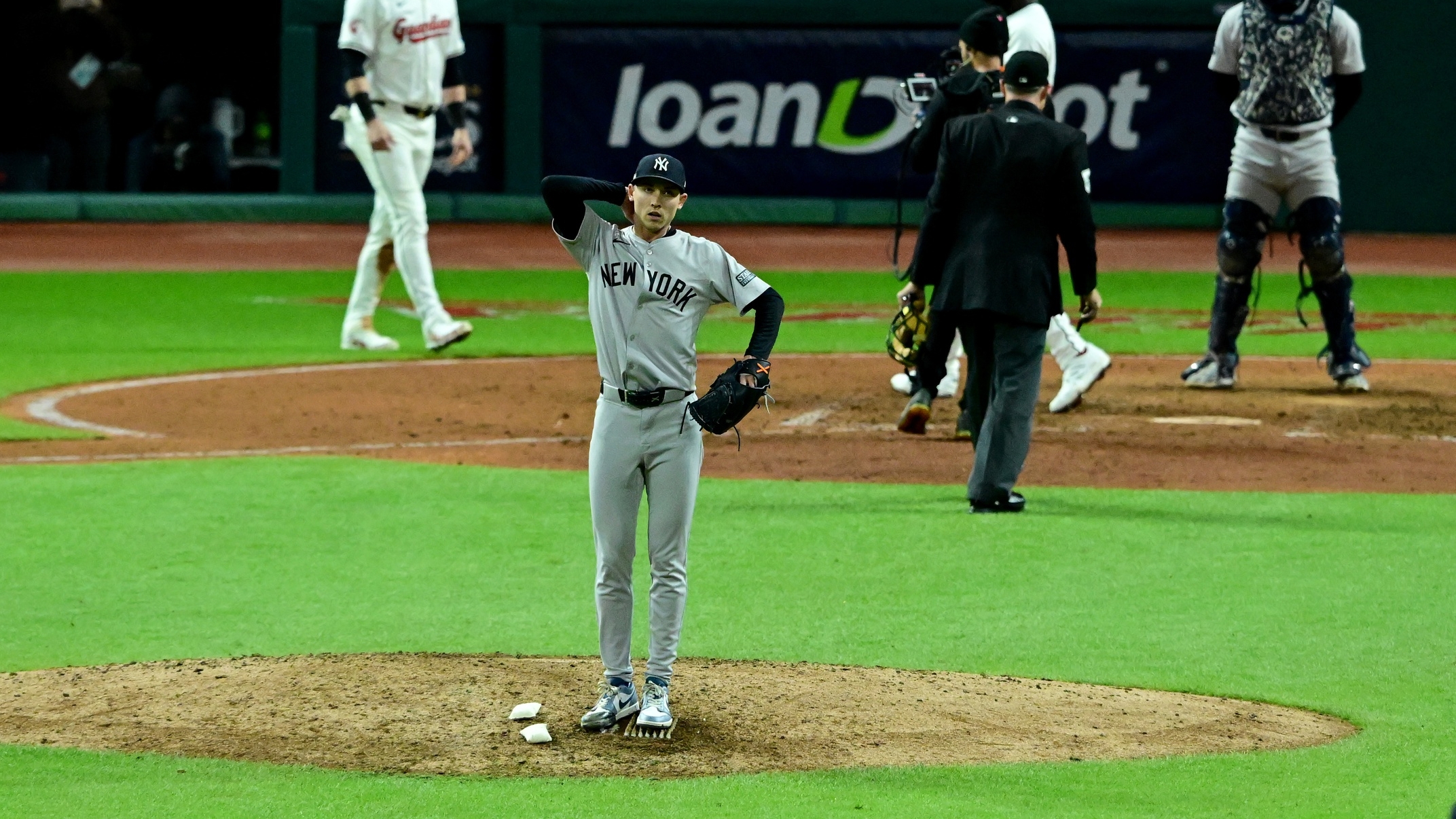 Oct 17, 2024; Cleveland, Ohio, USA; New York Yankees pitcher Luke Weaver (30) reacts after giving up a two-run home run during the ninth inning against the Cleveland Guardians in game 3 of the American League Championship Series at Progressive Field. / David Dermer-Imagn Images
