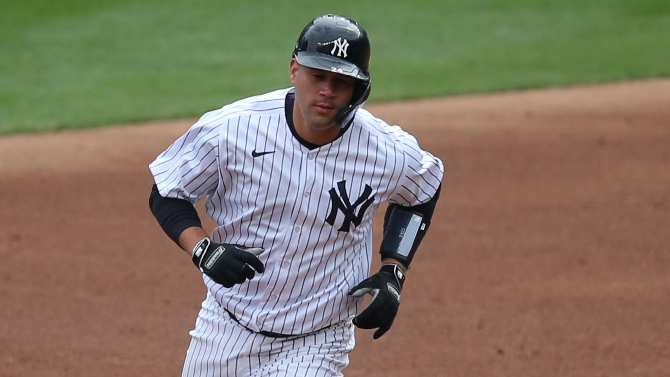 Apr 1, 2021; Bronx, New York, USA; New York Yankees catcher Gary Sanchez (24) rounds the bases after hitting a two run home run against the Toronto Blue Jays during the second inning of an opening day game at Yankee Stadium. / Brad Penner-USA TODAY Sports
