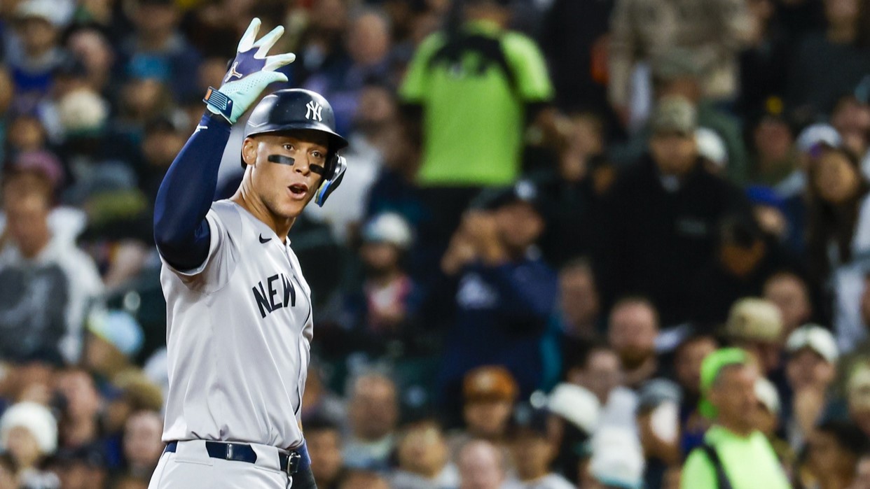 Sep 17, 2024; Seattle, Washington, USA; New York Yankees designated hitter Aaron Judge (99) reacts towards the Yankee dugout after hitting a tow-run single against the Seattle Mariners during the second inning at T-Mobile Park. / Joe Nicholson-Imagn Images