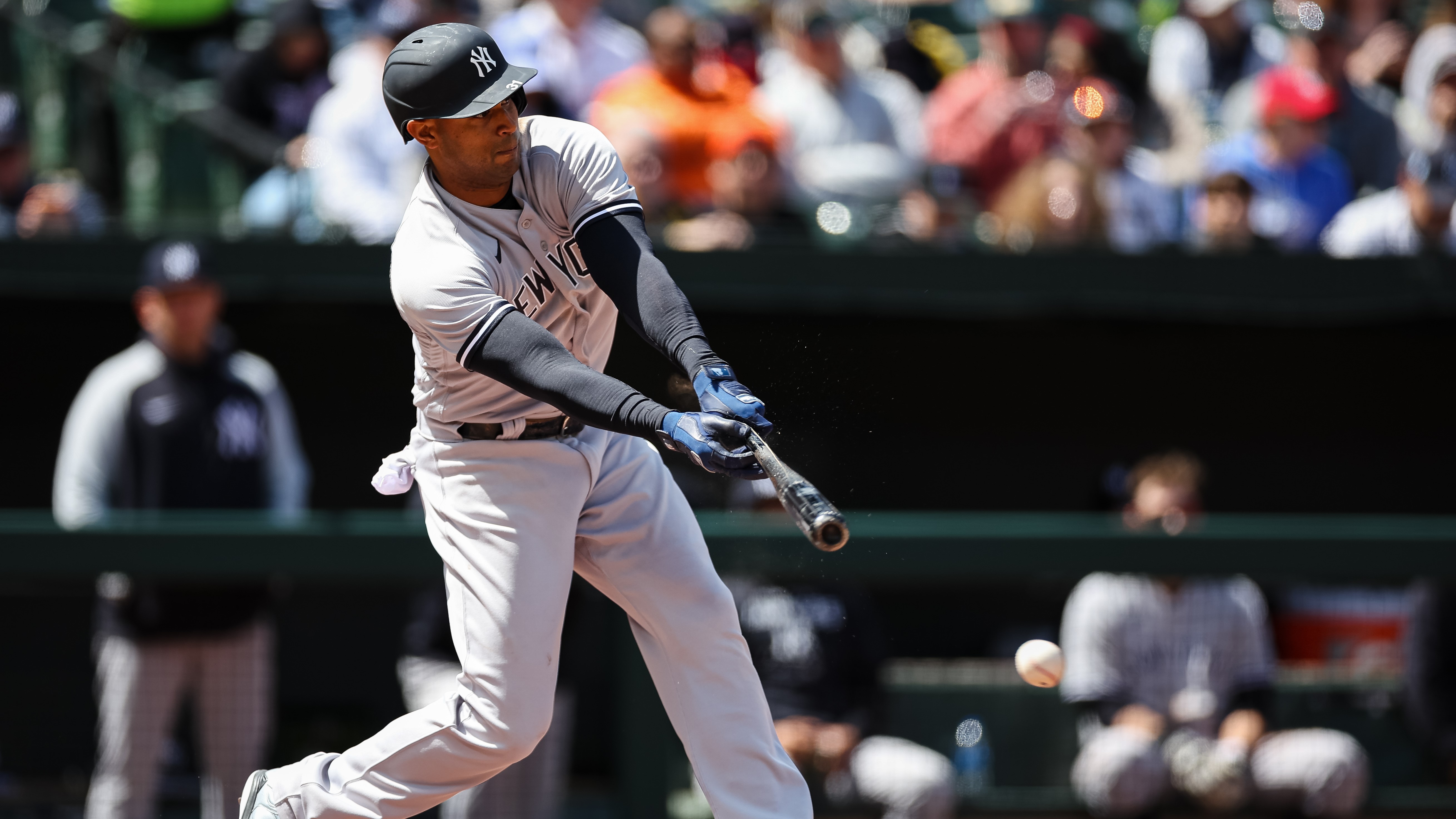 Apr 17, 2022; Baltimore, Maryland, USA; New York Yankees center fielder Aaron Hicks (31) singles against the Baltimore Orioles during the third inning at Oriole Park at Camden Yards. / Scott Taetsch-USA TODAY Sports