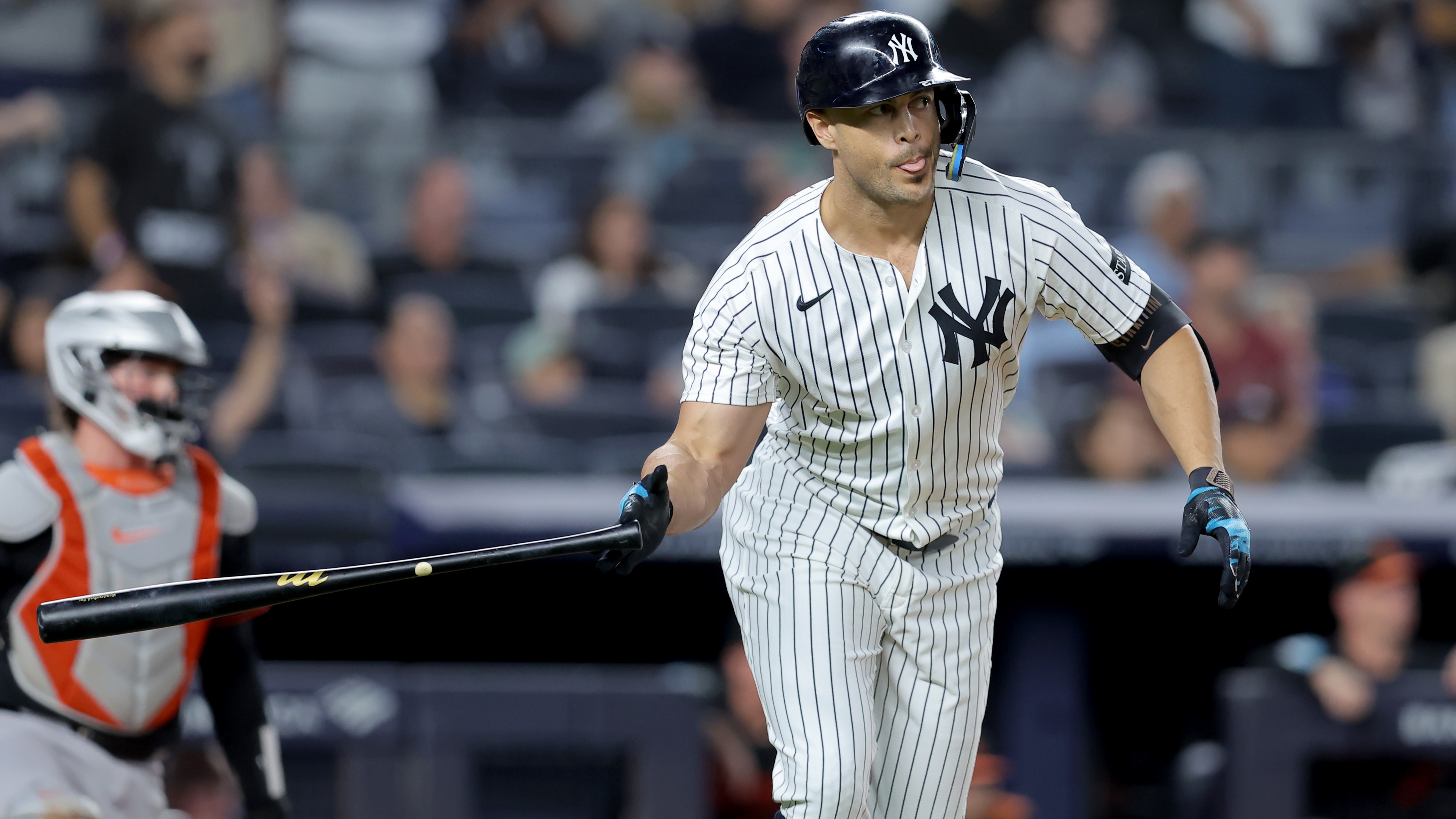 Giancarlo Stanton smacks two homers in Yankees' 8-4 win over OriolesNew York remains tied with Toronto atop AL East with two games remaining9/27/2025, 2:04 AMTom HanslinFreelance Editorial ProducerSep 26, 2025; Bronx, New York, USA; New York Yankees designated hitter Giancarlo Stanton (27) watches his two run home run against the Baltimore Orioles during the first inning at Yankee Stadium / Brad Penner-Imagn Images