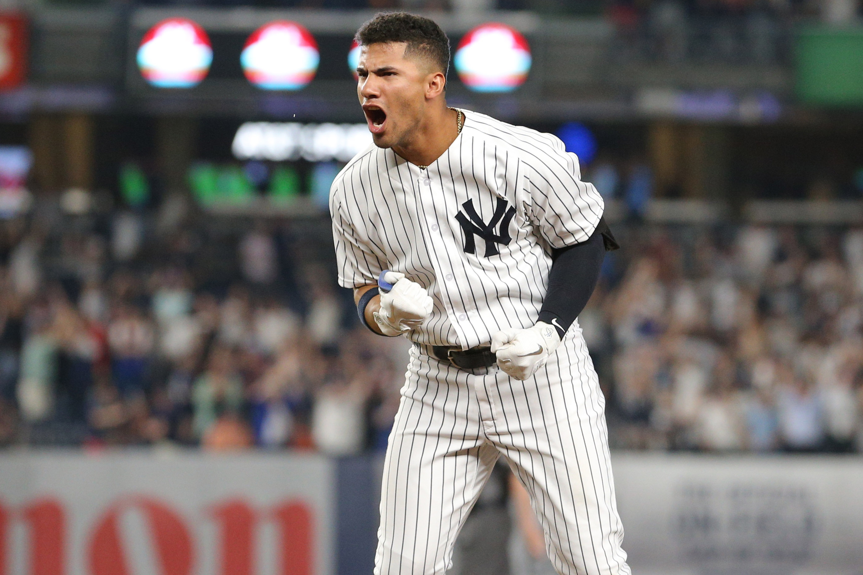May 29, 2018; Bronx, NY, USA; New York Yankees second baseman Gleyber Torres (25) reacts after hitting the game winning single against the Houston Astros during the tenth inning at Yankee Stadium. Mandatory Credit: Brad Penner-USA TODAY Sports / Brad Penner