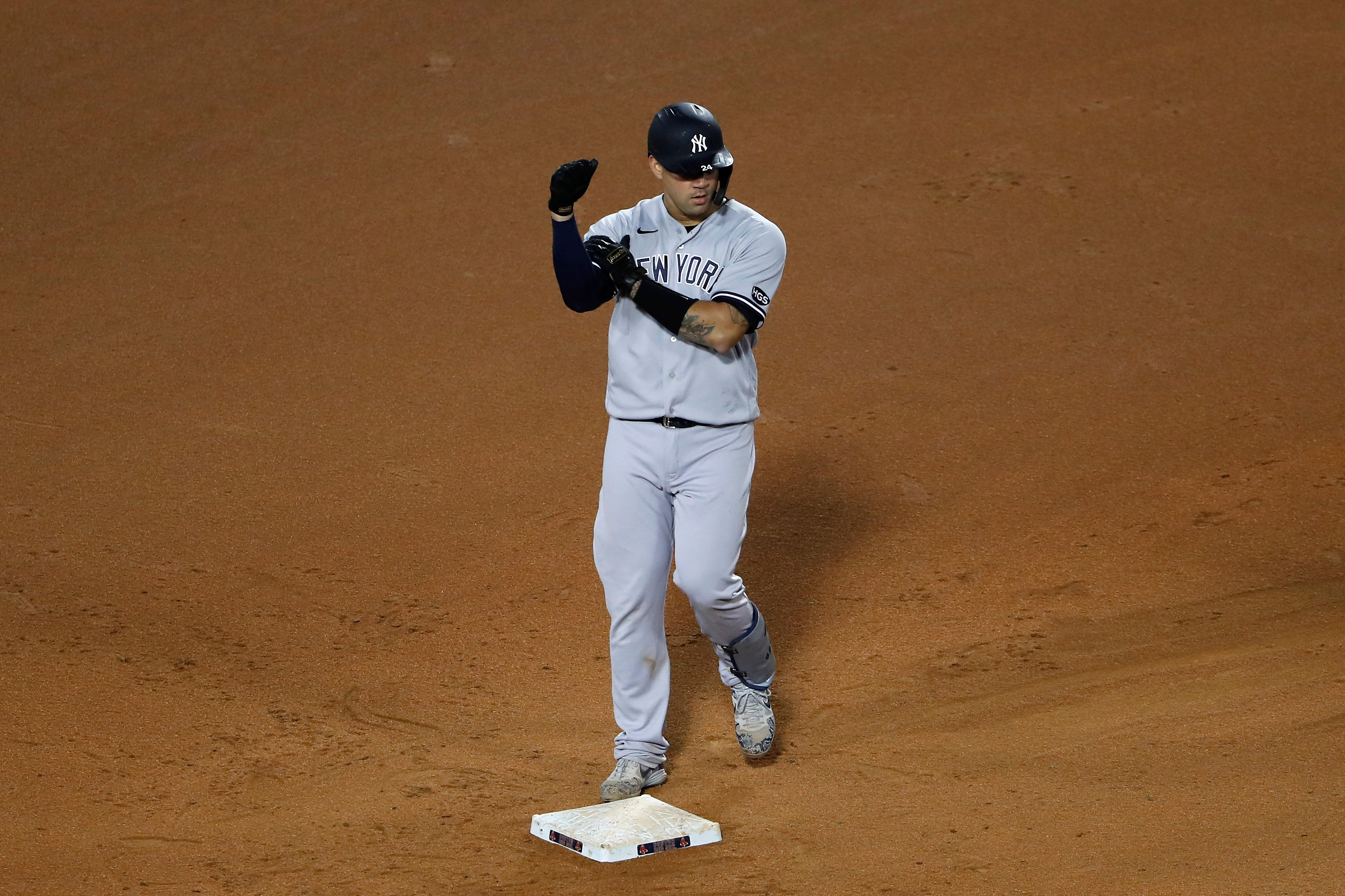 Sep 18, 2020; Boston, Massachusetts, USA; New York Yankees catcher Gary Sanchez (24) touches his muscle as he looks towards the Yankees dugout after hitting a two-run double against the Boston Red Sox during the seventh inning at Fenway Park. Mandatory Credit: Winslow Townson-USA TODAY Sports / Winslow Townson-USA TODAY Sports
