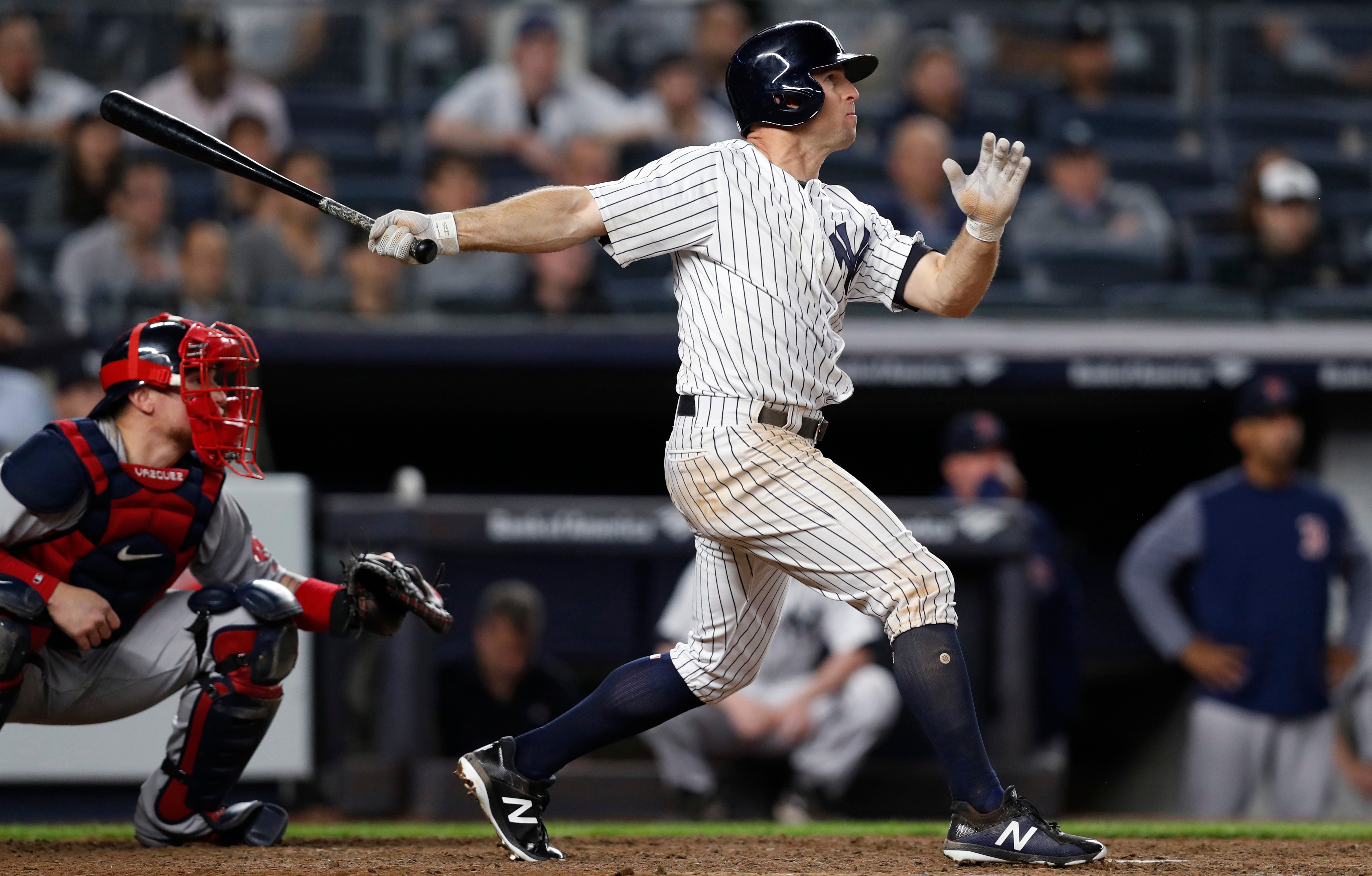 New York Yankees Brett Gardner (11) follows through on a two-run triple during the eighth inning of a baseball game against the Boston Red Sox in New York, Wednesday, May 9, 2018. (AP Photo/Kathy Willens) / Kathy Willens/AP