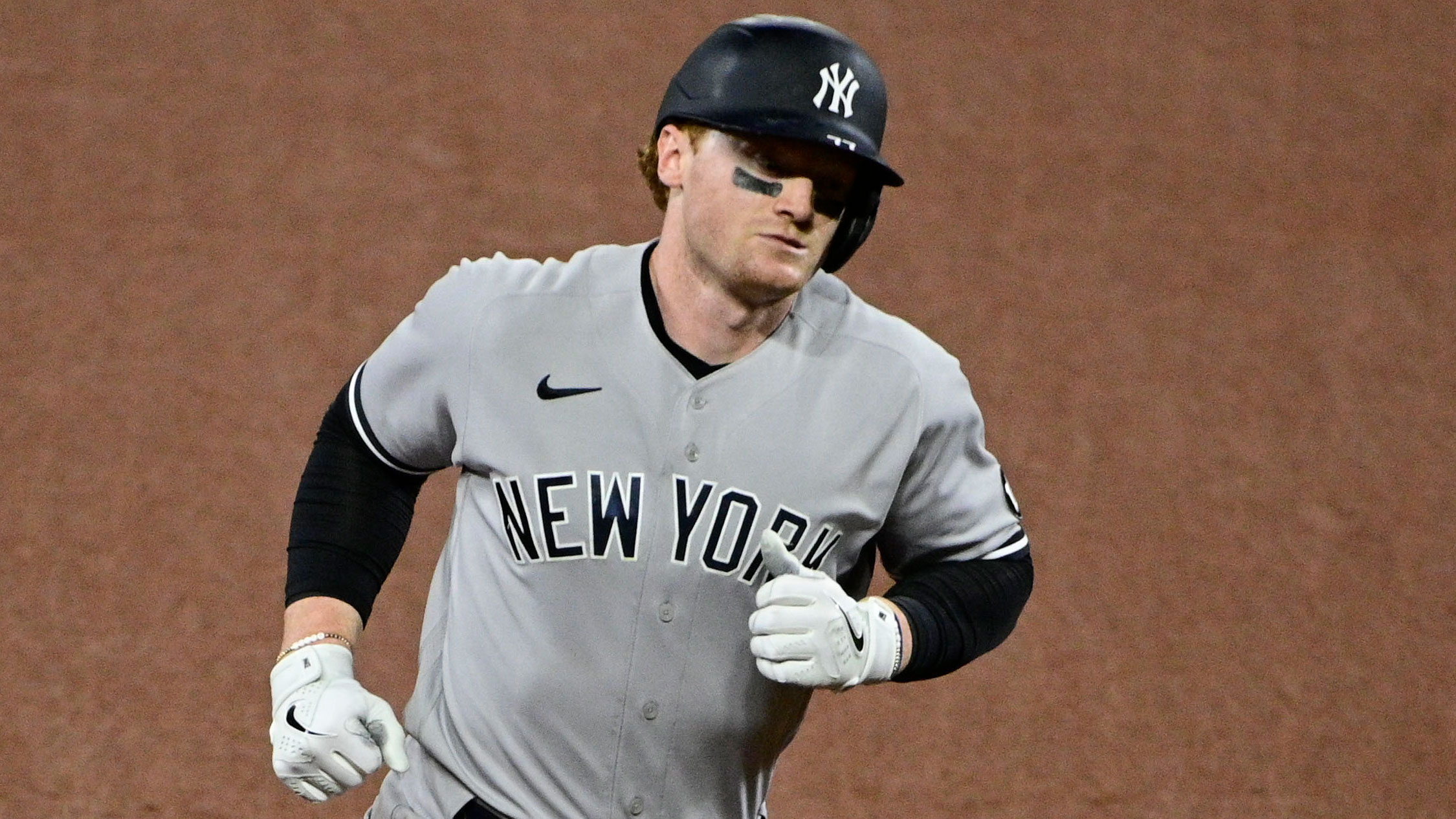 Apr 28, 2021; Baltimore, Maryland, USA; New York Yankees left fielder Clint Frazier (77) rounds the bases after hitting a solo home ruin in the eighth inning against the Baltimore Orioles at Oriole Park at Camden Yards. / Tommy Gilligan-USA TODAY Sports