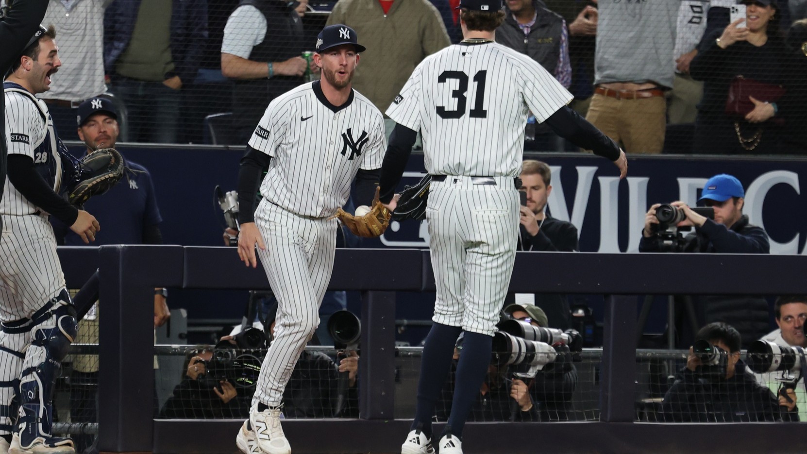 Oct 2, 2025; Bronx, New York, USA; New York Yankees third baseman Ryan McMahon (19) reacts with pitcher Cam Schlittler (31) after catching a popup in the eighth inning against the Boston Red Sox during game three of the Wildcard round for the 2025 MLB playoffs at Yankee Stadium. / Vincent Carchietta-Imagn Images