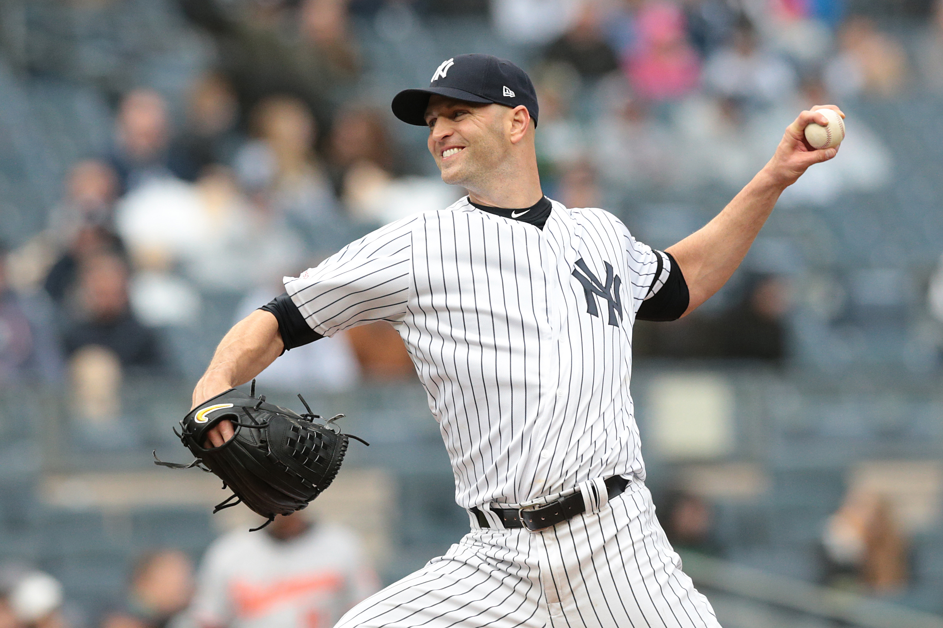 New York Yankees starting pitcher J.A. Happ delivers a pitch during the first inning against the Baltimore Orioles at Yankee Stadium. / Vincent Carchietta/USA TODAY Sports