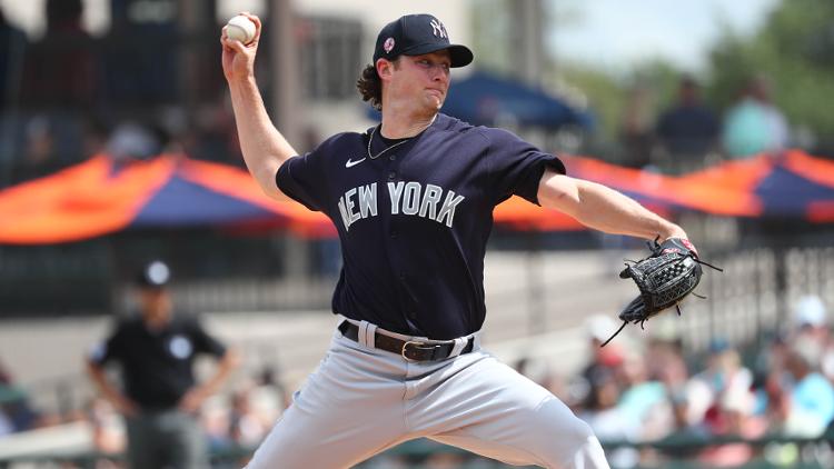 Mar 5, 2020; Lakeland, Florida, USA; New York Yankees starting pitcher Gerrit Cole (45) throws a pitch during the first inning against the Detroit Tigers at Publix Field at Joker Marchant Stadium. / Kim Klement/USA TODAY SportsMar 5, 2020; Lakeland, Florida, USA; New York Yankees starting pitcher Gerrit Cole (45) throws a pitch during the first inning against the Detroit Tigers at Publix Field at Joker Marchant Stadium. / Kim Klement/USA TODAY Sports