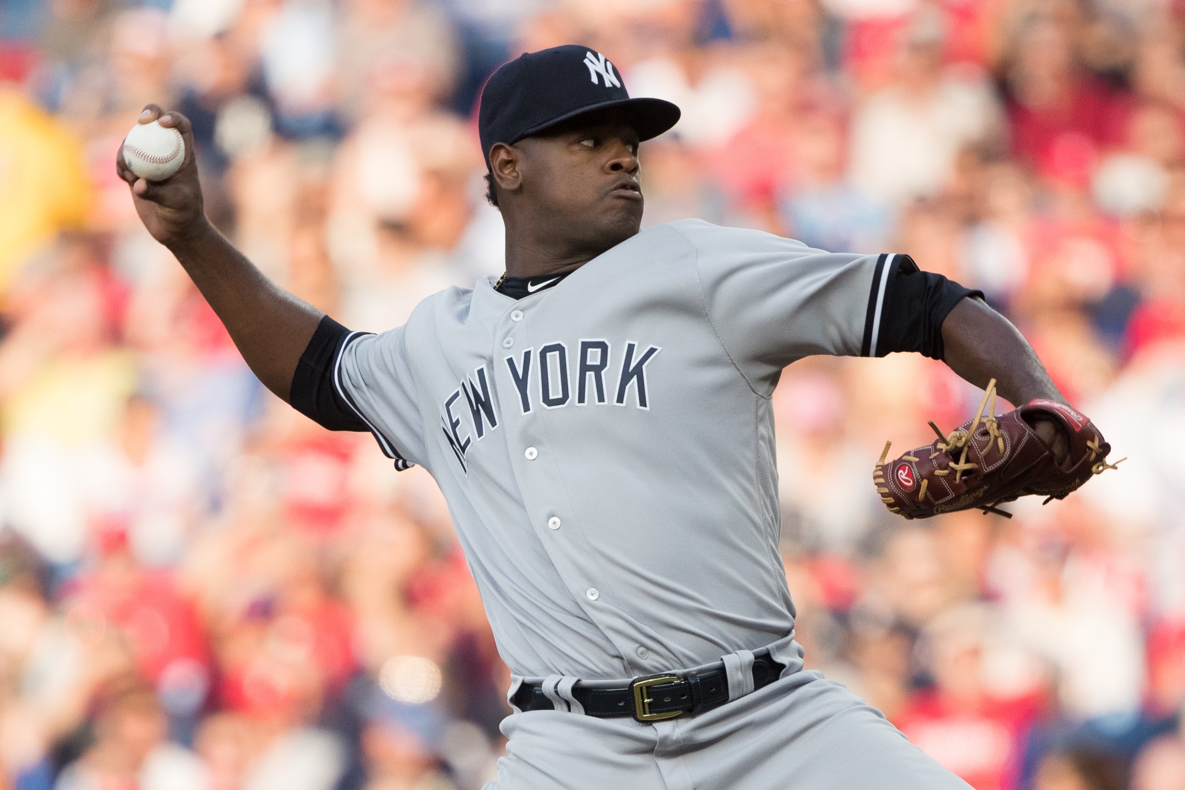 Jun 26, 2018; Philadelphia, PA, USA; New York Yankees starting pitcher Luis Severino (40) pitches during the first inning against the Philadelphia Phillies at Citizens Bank Park. Mandatory Credit: Bill Streicher-USA TODAY Sports / Bill Streicher