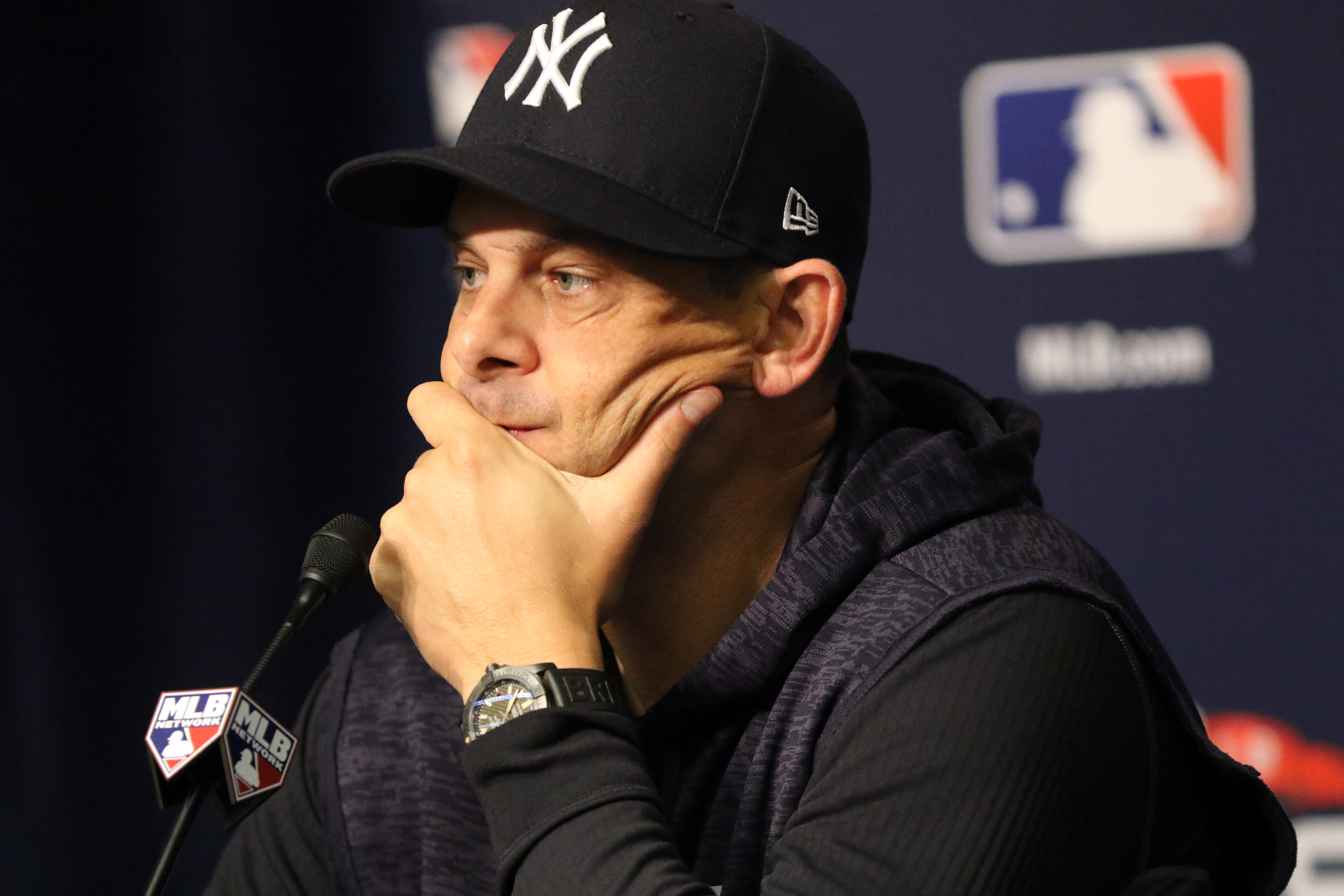 New York Yankees manager Aaron Boone addresses the media prior to Game 3 of the 2018 ALDS against the Boston Red Sox at Yankee Stadium. / Kevin R. Wexler/NorthJersey.com via USA TODAY Network