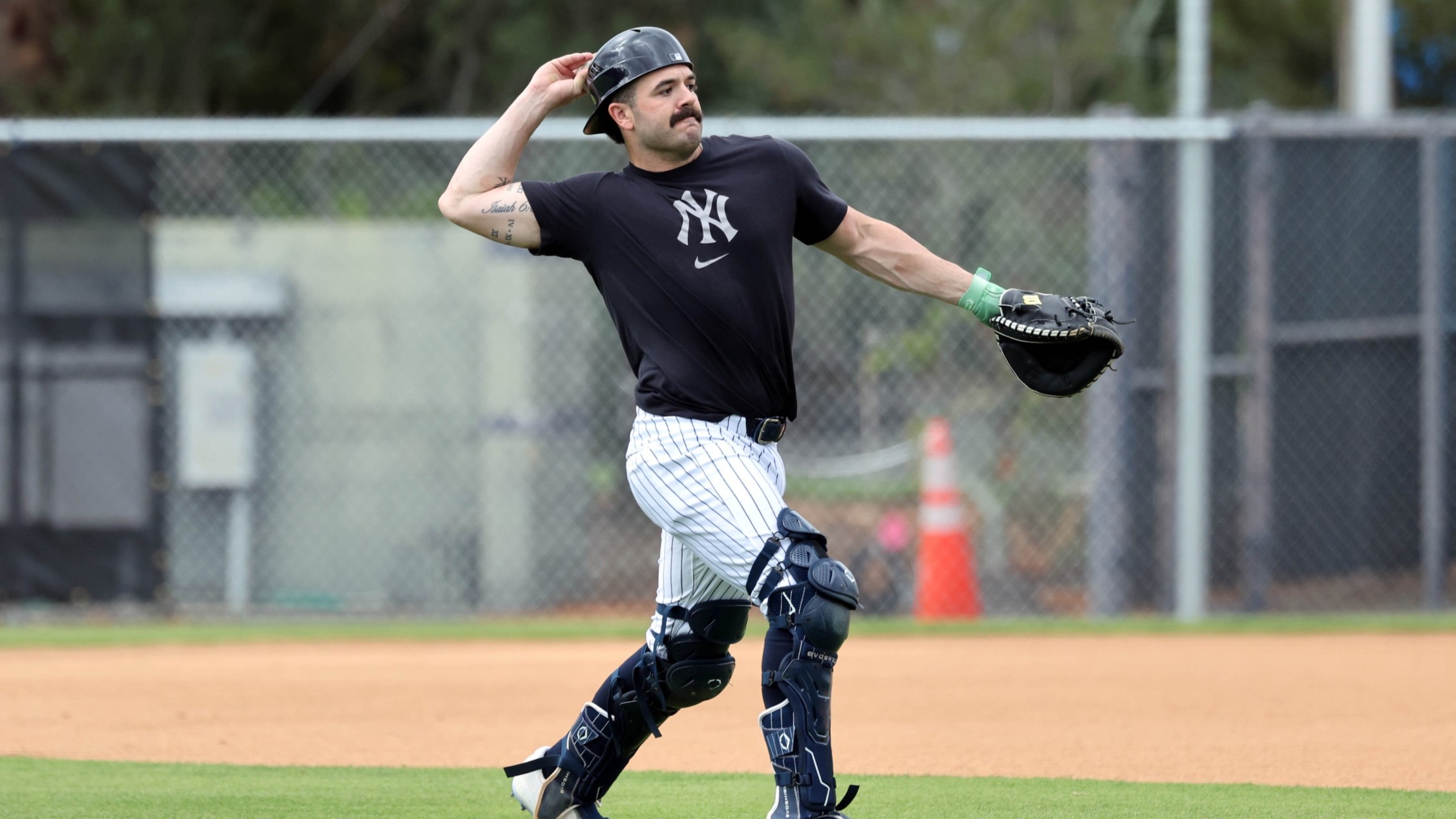 Feb 20, 2025; Tampa, FL, USA; New York Yankees catcher Austin Wells (28) during work outs at George M. Steinbrenner Field. / Kim Klement Neitzel-Imagn Images