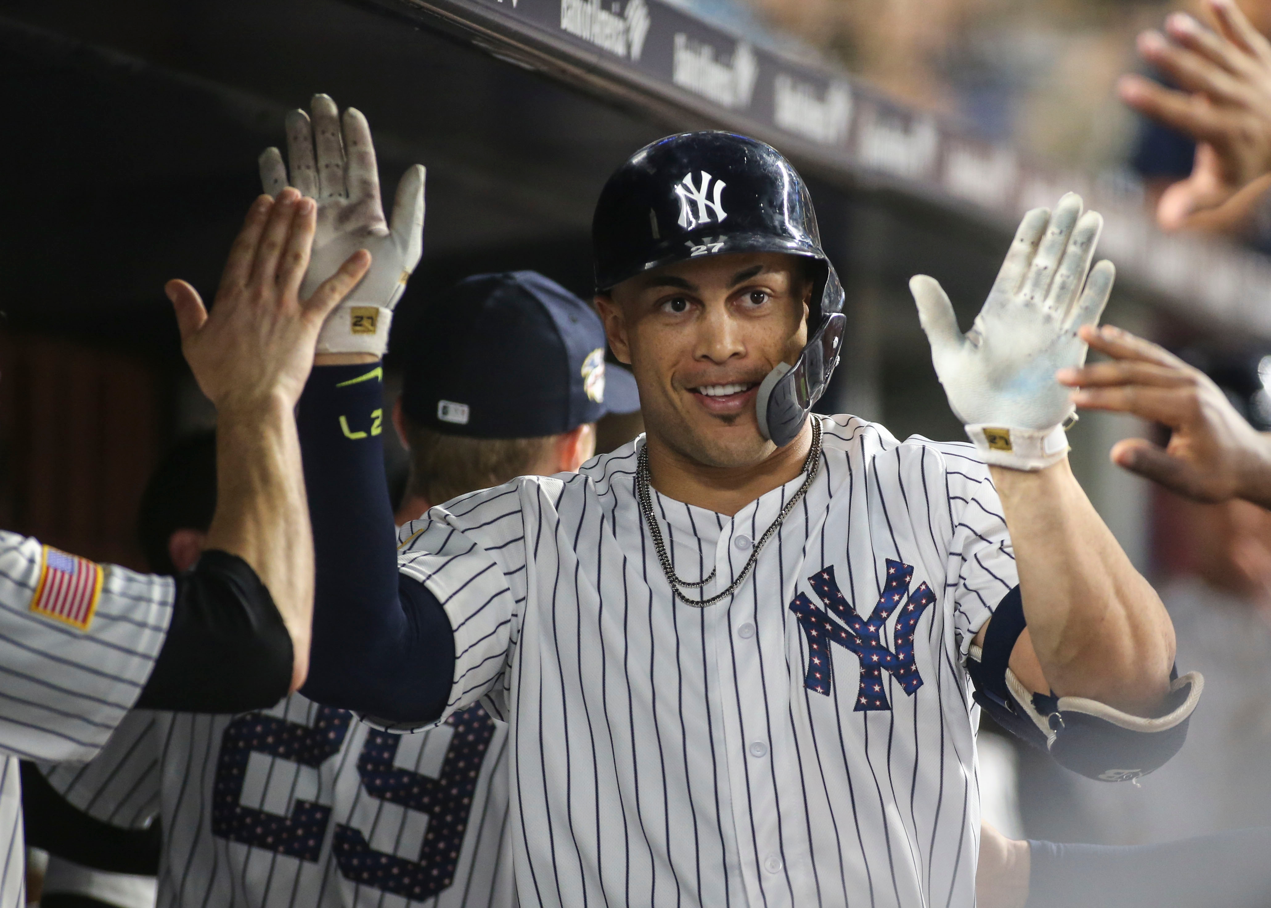 Jul 3, 2018; Bronx, NY, USA; New York Yankees right fielder Giancarlo Stanton (27) is congratulated after hitting a home run in the eighth inning against the Atlanta Braves at Yankee Stadium. Mandatory Credit: Wendell Cruz-USA TODAY Sports / Wendell Cruz