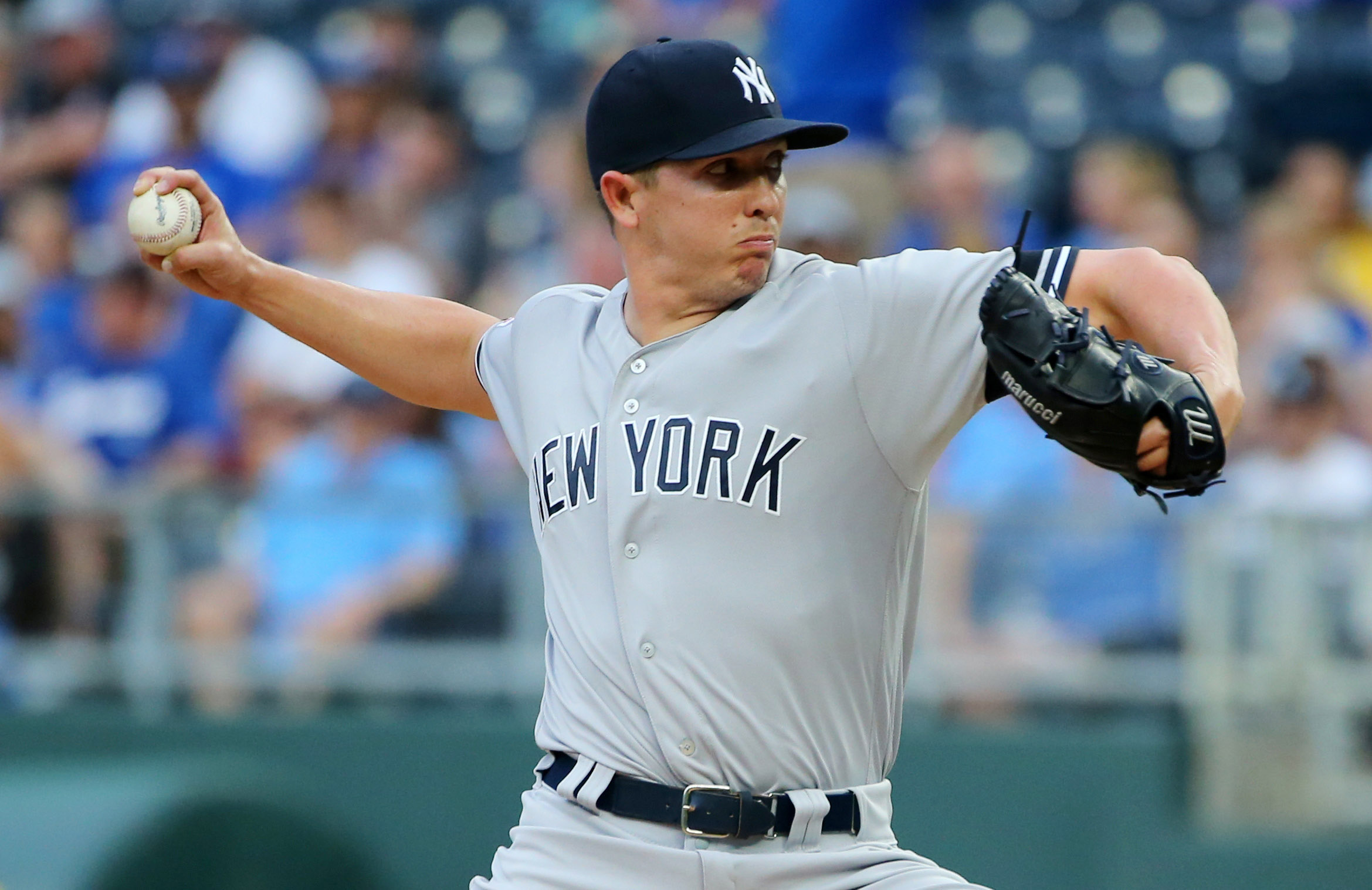 May 25, 2019; Kansas City, MO, USA; New York Yankees starting pitcher Chad Green (57) pitches against the Kansas City Royals during the first inning in the second game of a double header at Kauffman Stadium. Mandatory Credit: Jay Biggerstaff-USA TODAY Sports / Jay Biggerstaff