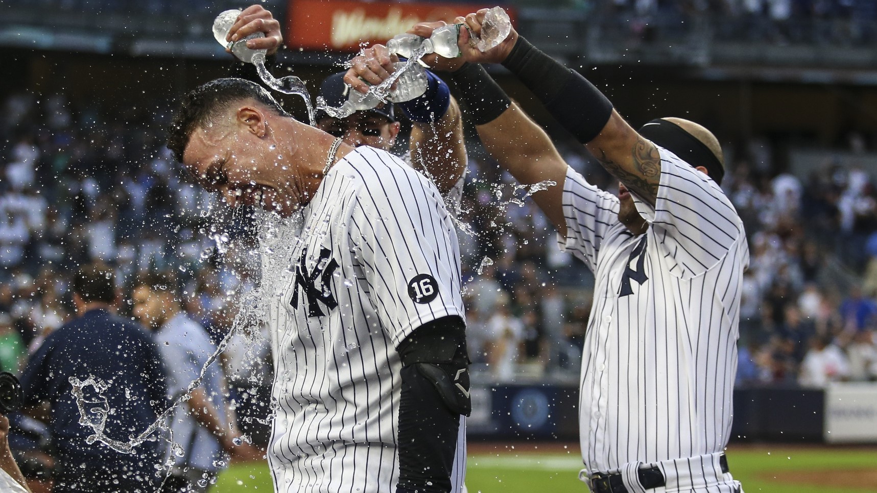 Oct 3, 2021; Bronx, New York, USA; New York Yankees right fielder Aaron Judge (99) is doused with water after his game winning RBI single to defeat the Tampa Bay Rays 1-0 and clinch a wildcard playoff spot at Yankee Stadium. / Wendell Cruz-USA TODAY Sports