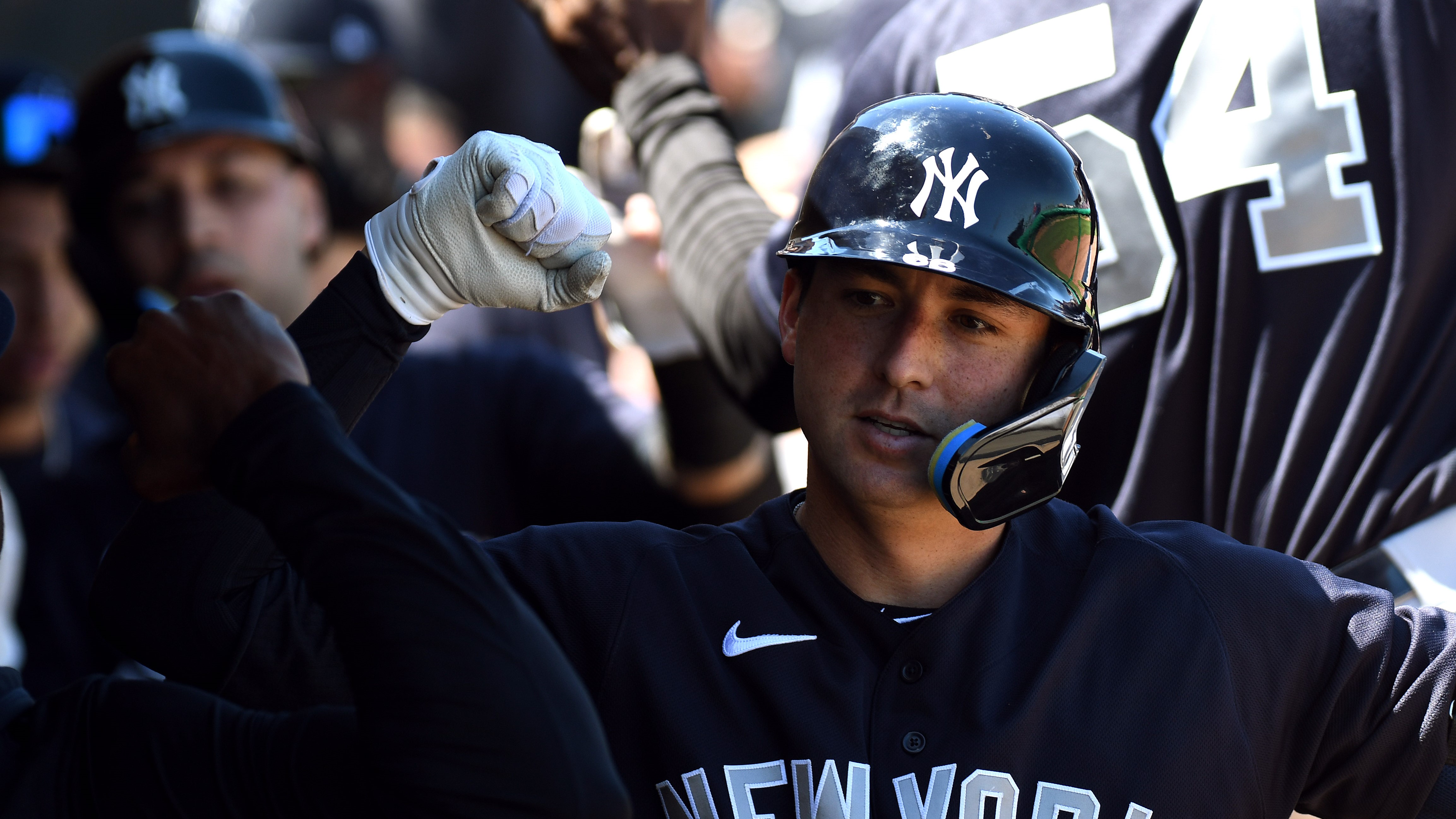 Mar 25, 2022; Clearwater, Florida, USA; New York Yankees catcher Kyle Higashioka (66) celebrates after hitting a two run home run in the second inning against the Philadelphia Phillies during spring training at BayCare Ballpark. / Jonathan Dyer-USA TODAY Sports
