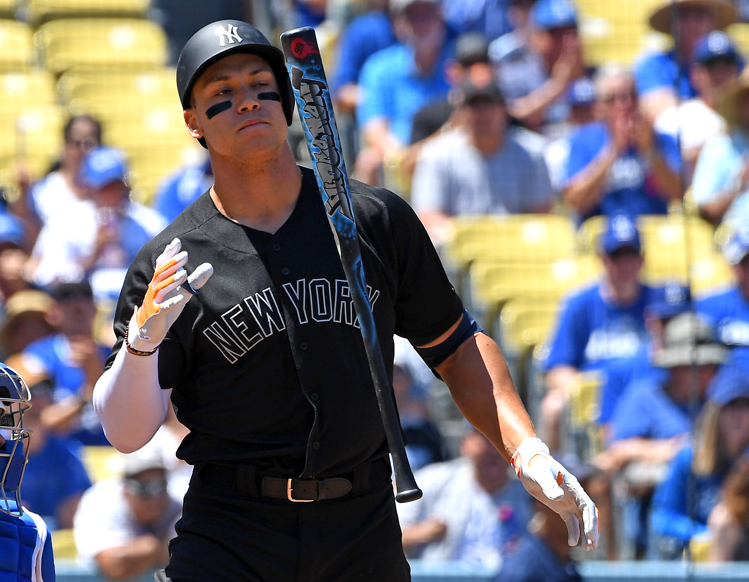 Aug 24, 2019; Los Angeles, CA, USA; New York Yankees right fielder Aaron Judge (99) flips hit bat after striking out in the first inning of the game against the Los Angeles Dodgers on MLB Players' Weekend at Dodger Stadium. Mandatory Credit: Jayne Kamin-Oncea-USA TODAY Sportsundefined