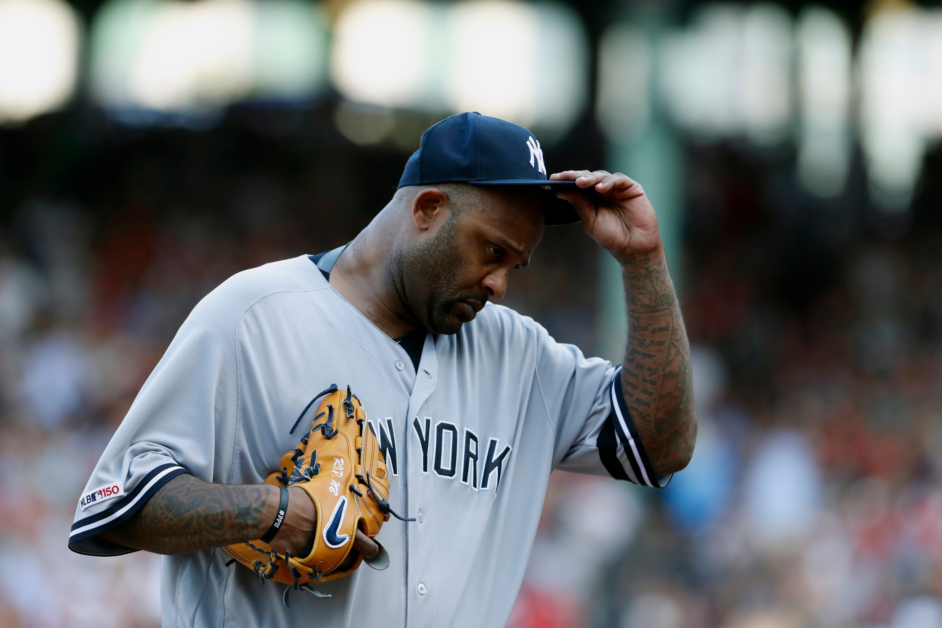 Jul 27, 2019; Boston, MA, USA; New York Yankees starting pitcher CC Sabathia (52) tips his hat to the crowd as he is taken out of the game against the Boston Red Sox in the first inning at Fenway Park. Mandatory Credit: David Butler II-USA TODAY Sports / David Butler II