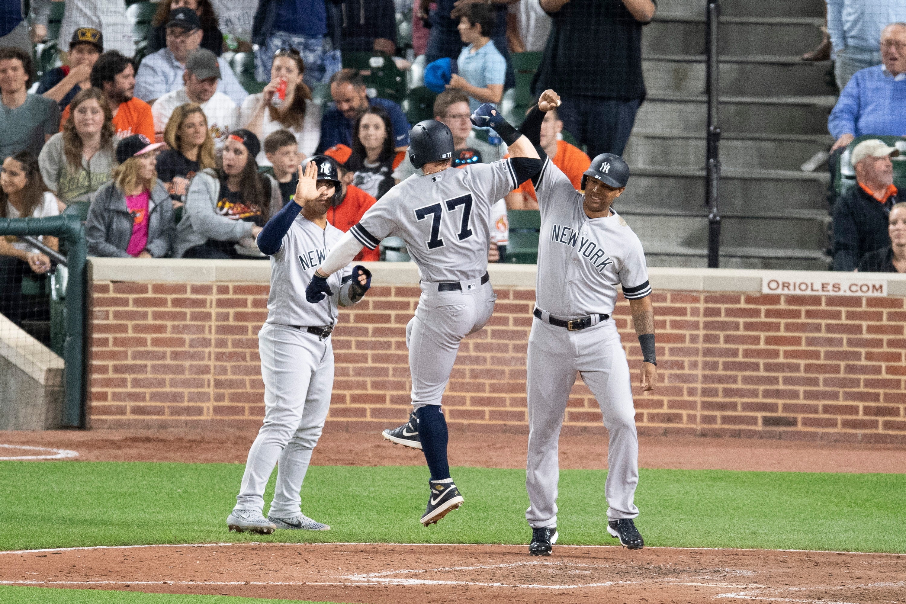 May 21, 2019; Baltimore, MD, USA; New York Yankees right fielder Clint Frazier (77) celebrates with second baseman Gleyber Torres (25) and center fielder Aaron Hicks (31) after hitting a three run home run in the fifth inning against the Baltimore Orioles at Oriole Park at Camden Yards. Mandatory Credit: Tommy Gilligan-USA TODAY Sports / Tommy Gilligan