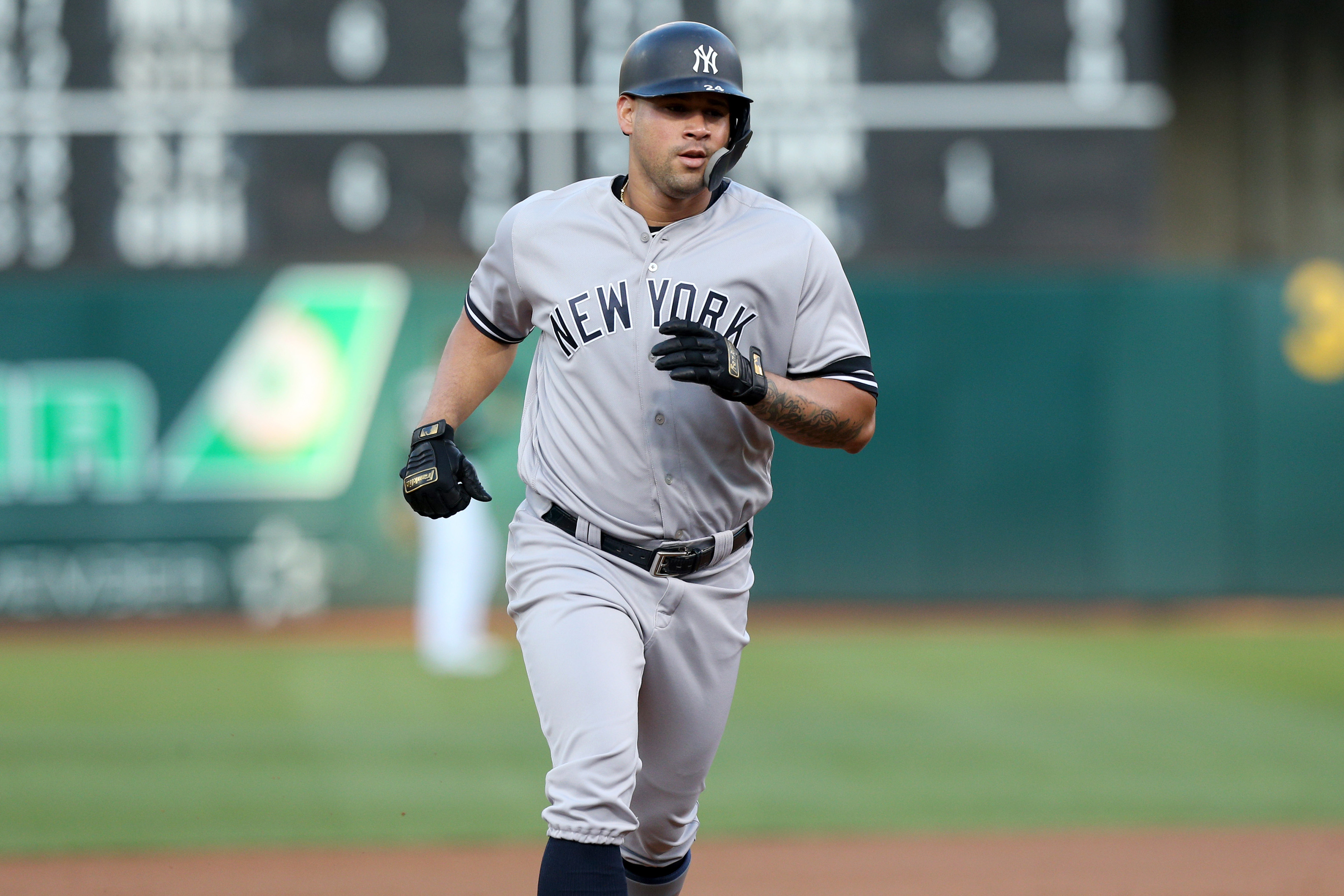Aug 20, 2019; Oakland, CA, USA; New York Yankees catcher Gary Sanchez (24) prepares to round third base after hitting a home run against the Oakland Athletics in the first inning at Oakland Coliseum. Mandatory Credit: Cary Edmondson-USA TODAY Sports / Cary Edmondson