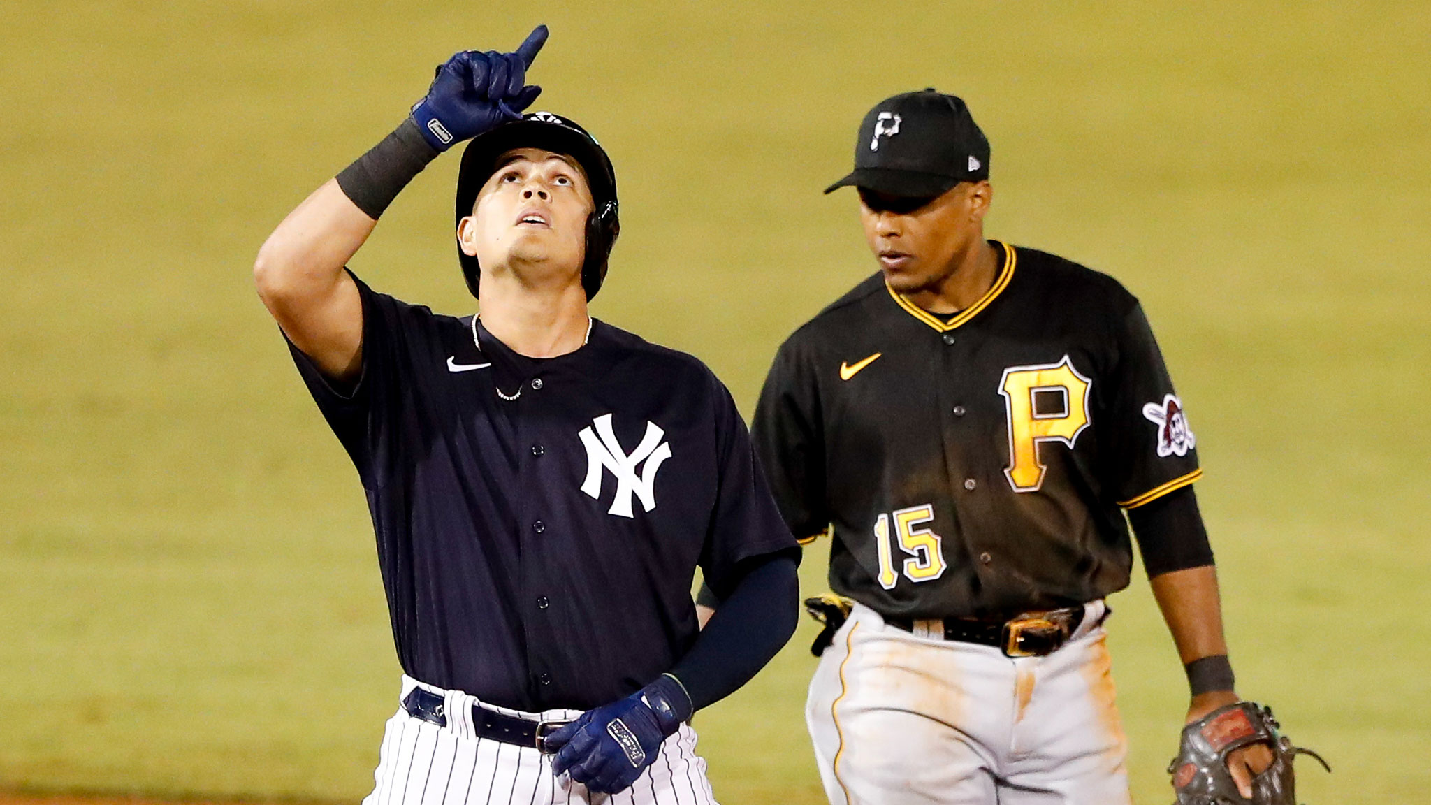 Mar 10, 2021; Tampa, Florida, USA; New York Yankees third baseman Gio Urshela (29) reacts after hitting a double against the Pittsburgh Pirates in the bottom of the second inning during spring training at George M. Steinbrenner Field. / Nathan Ray Seebeck-USA TODAY Sports
