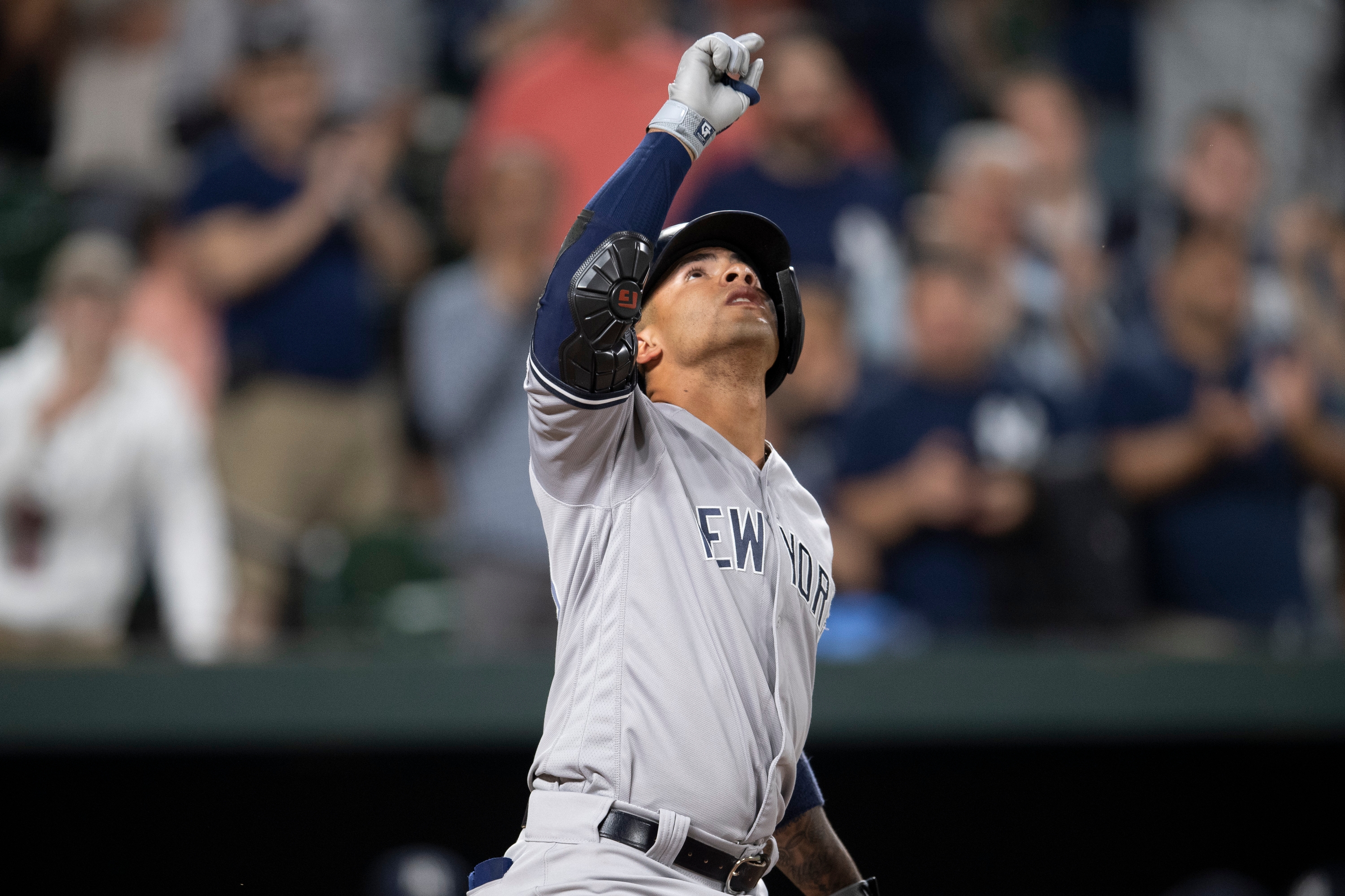 May 22, 2019; Baltimore, MD, USA; New York Yankees shortstop Gleyber Torres (25) reacts after hitting a solo home run in the fifth inning against the Baltimore Orioles at Oriole Park at Camden Yards. Mandatory Credit: Tommy Gilligan-USA TODAY Sports / Tommy Gilligan