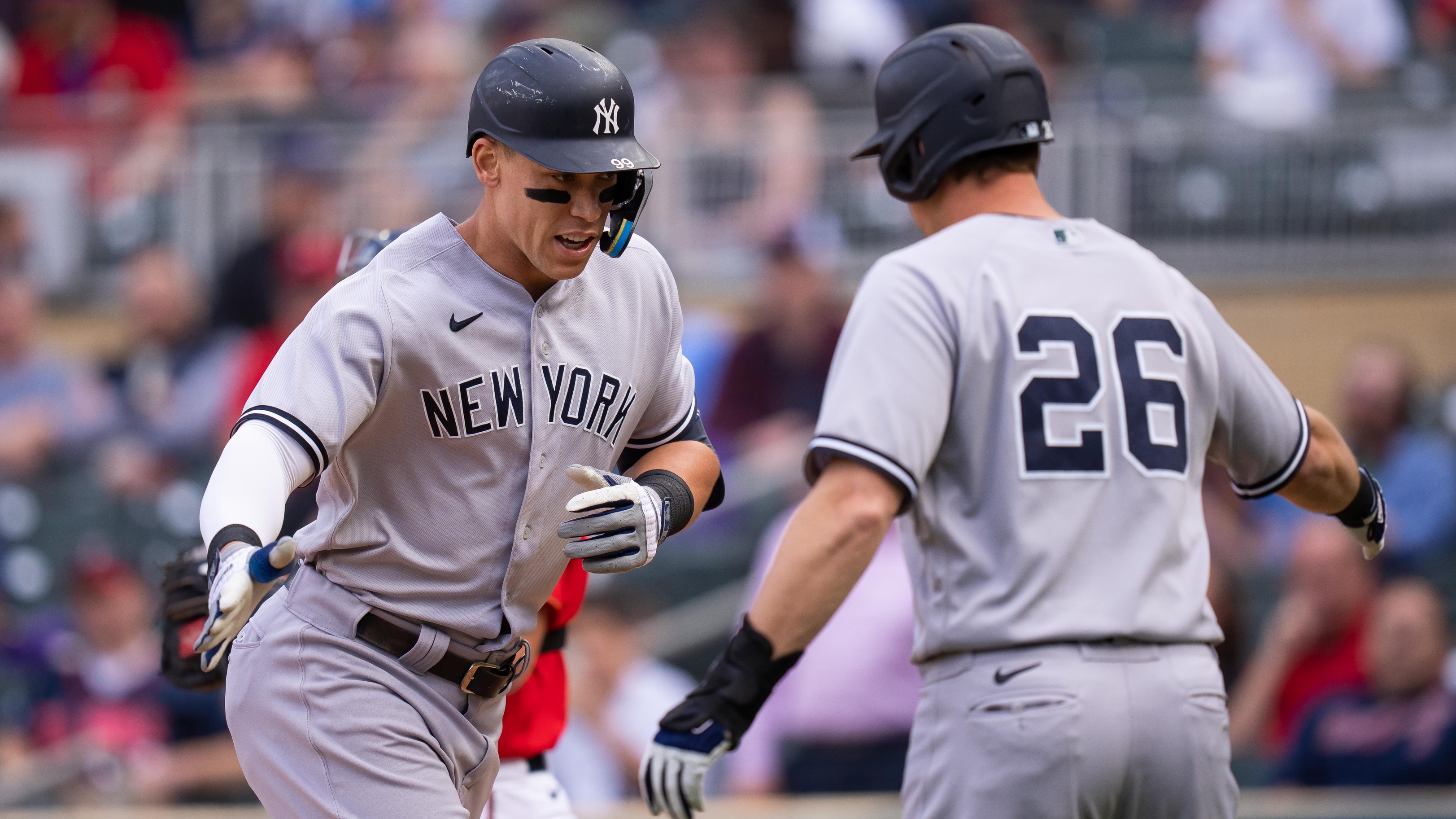 Yankees takeaways from Tuesday's 10-4 win over Twins, including three homers from the top of the lineupJudge blasted his MLB-leading 22nd homer of the year in the first inning6/8/2022, 3:33 AMJames O'ConnellFreelance Editorial ProducerJun 7, 2022; Minneapolis, Minnesota, USA; New York Yankees right fielder Aaron Judge (99) celebrates his home run with second baseman DJ LeMahieu (26) against the Minnesota Twins in the first inning at Target Field. / Brad Rempel-USA TODAY Sports