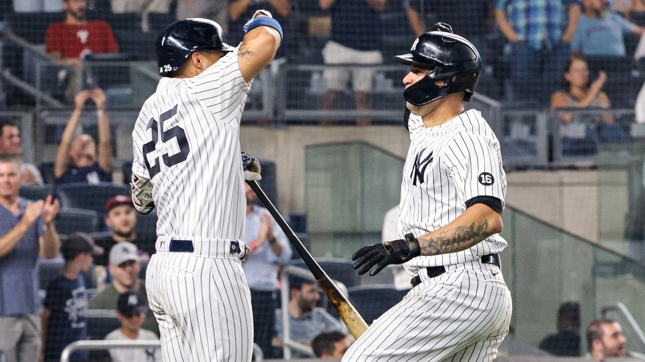 Jul 20, 2021; Bronx, New York, USA; New York Yankees catcher Gary Sanchez (24) celebrates his home run with shortstop Gleyber Torres (25) during the sixth inning against the Philadelphia Phillies at Yankee Stadium. / Vincent Carchietta-USA TODAY Sports