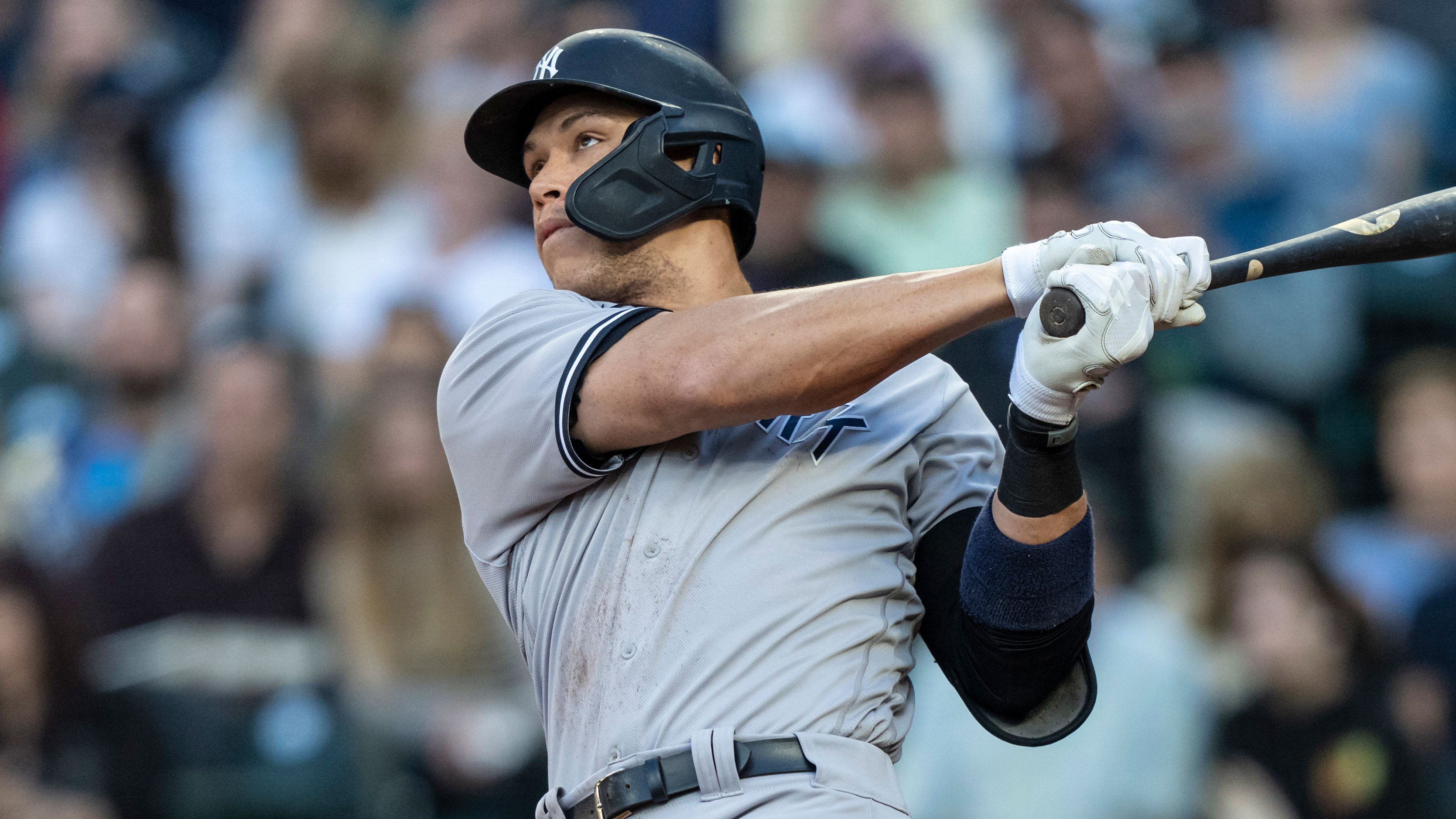 Jul 7, 2021; Seattle, Washington, USA; New York Yankees right fielder Aaron Judge (99) hits a two-run home run off of Seattle Mariners starting pitcher Yusei Kikuchi (not pictured) to score score leftfielder Tim Locastro (not pictured) during the second inning at T-Mobile Park. / Stephen Brashear-USA TODAY Sports