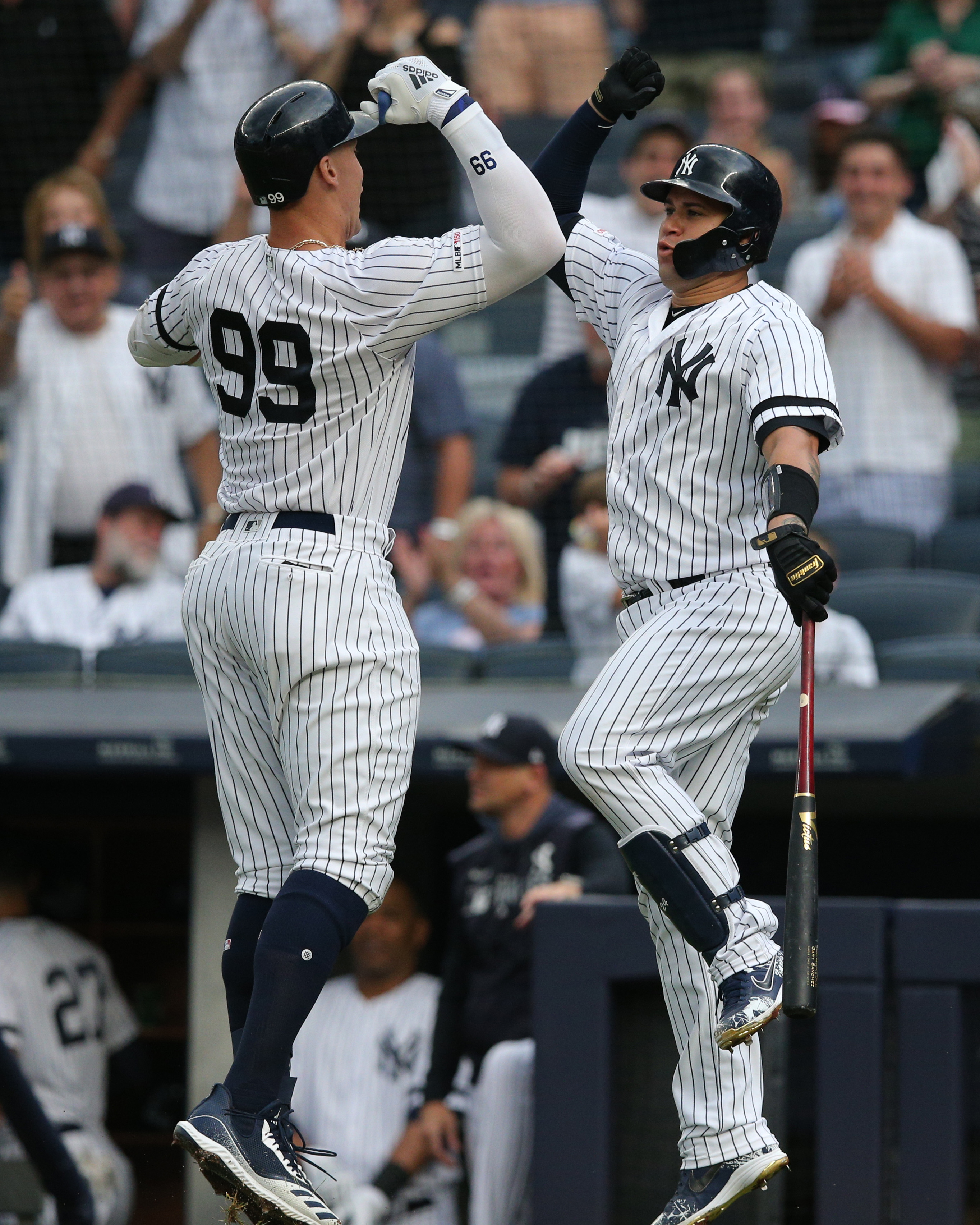 Jun 25, 2019; Bronx, NY, USA; New York Yankees right fielder Aaron Judge (99) celebrates his solo home run against the Toronto Blue Jays with catcher Gary Sanchez (24) during the first inning at Yankee Stadium. Mandatory Credit: Brad Penner-USA TODAY Sports / Brad Penner