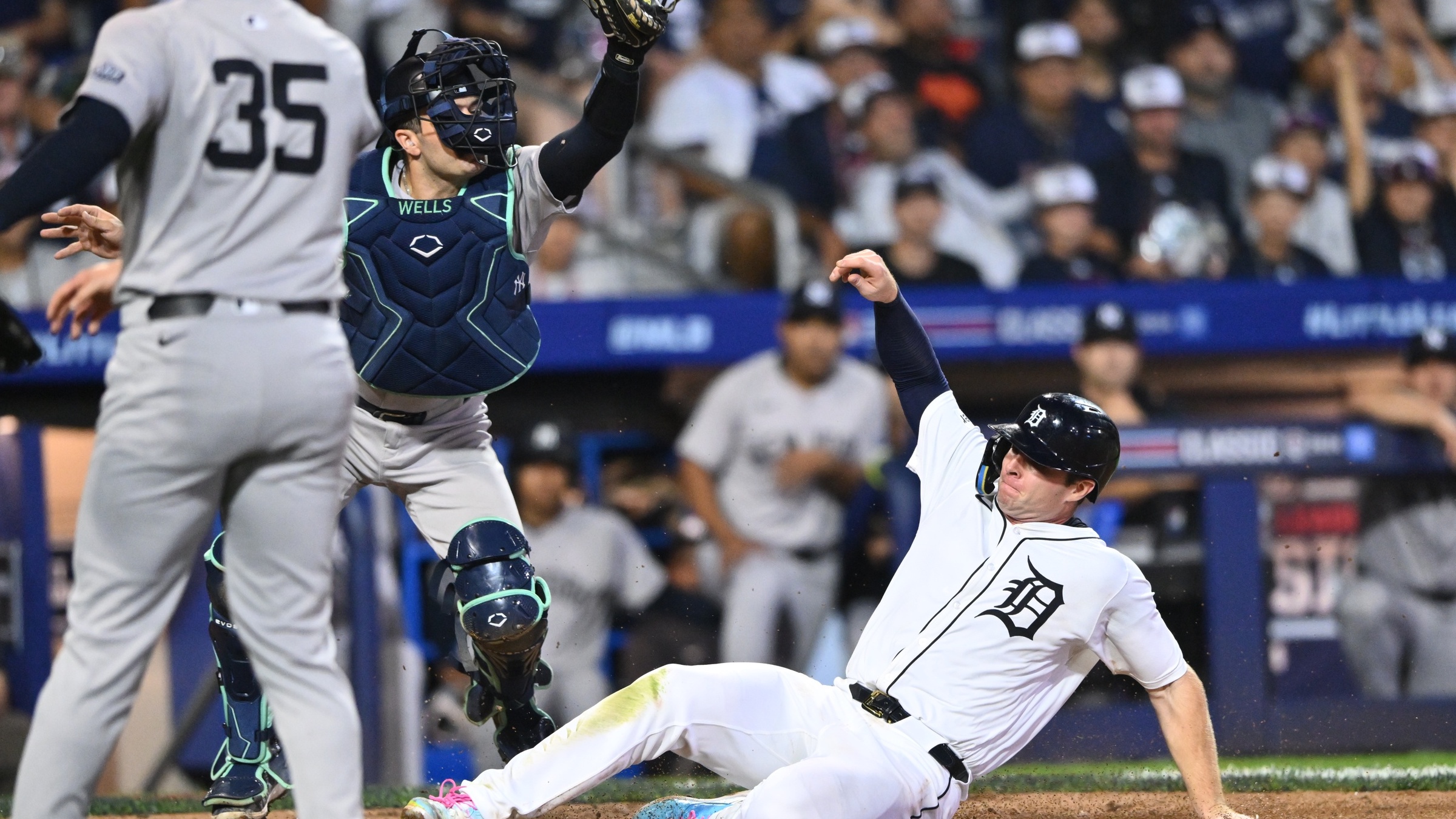 Yankees suffer walk-off loss in extras against Tigers after Clay Holmes blows another saveMarcus Stroman pitched six scoreless innings 8/19/2024, 2:11 AMRobert SanchezFreelance Editorial ProducerDetroit Tigers infielder Colt Keith (33) slides home to score against New York Yankees catcher Austin Wells (28) in the ninth inning at BB&T Ballpark at Historic Bowman Field. / Kyle Ross-USA TODAY Sports
