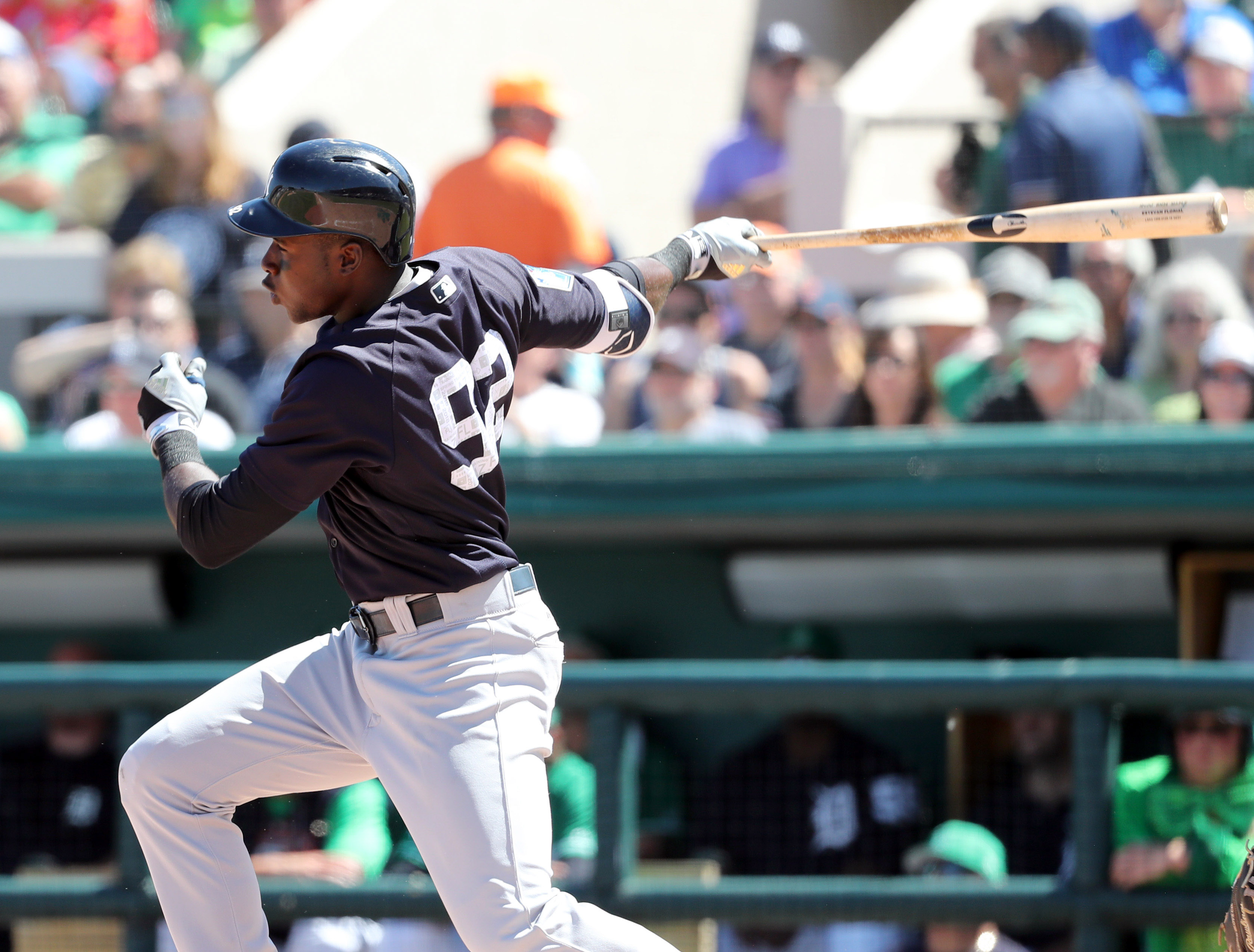 New York Yankees right fielder Estevan Florial hits an RBI single during the fourth inning against the Detroit Tigers at Publix Field at Joker Marchant Stadium. / Kim Klement/USA TODAY Sports
