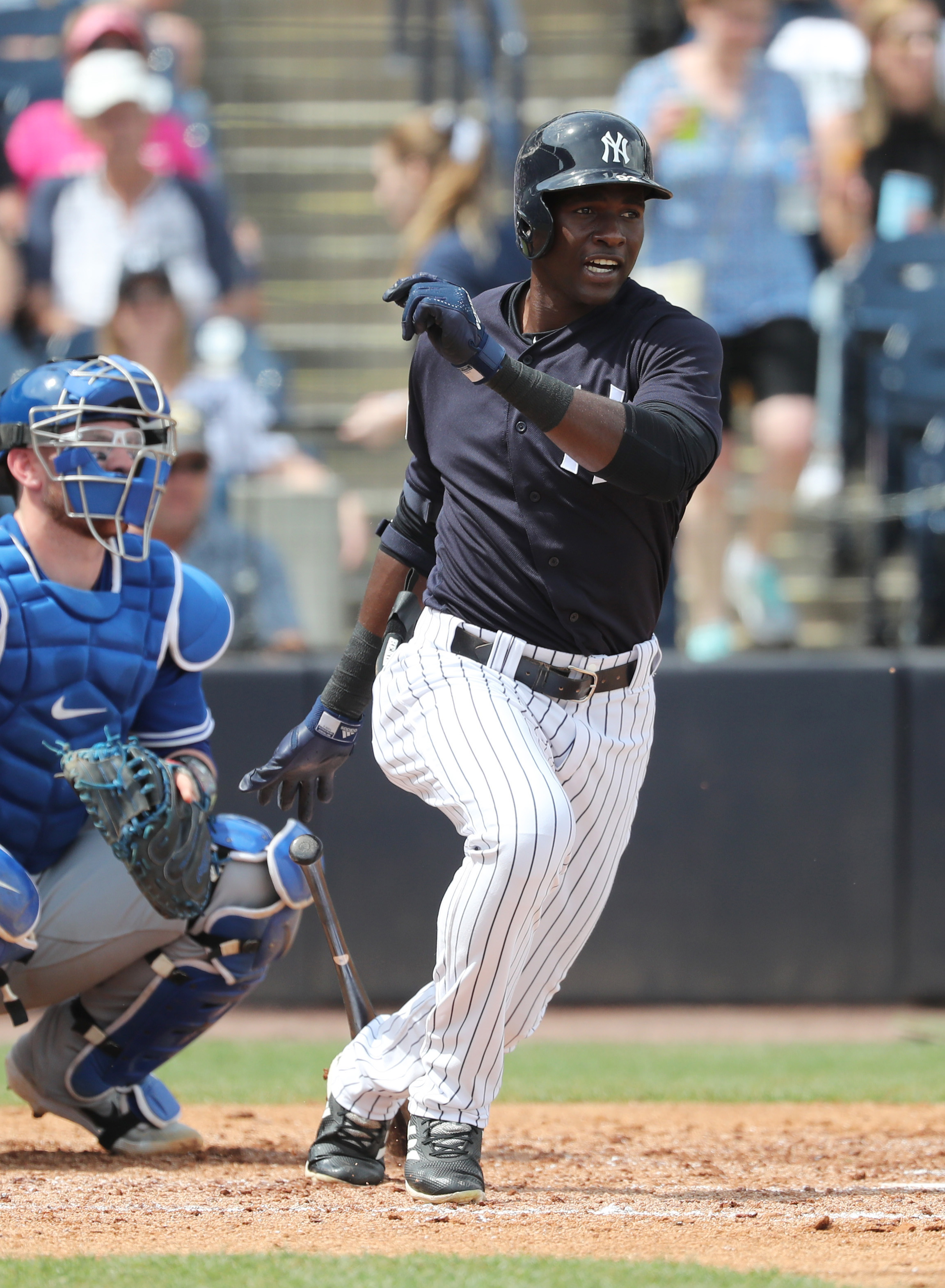 Mar 16, 2019; Tampa, FL, USA; New York Yankees center fielder Estevan Florial (92) singles during the fourth inning against the Toronto Blue Jays at George M. Steinbrenner Field. Mandatory Credit: Kim Klement-USA TODAY Sports / Kim Klement