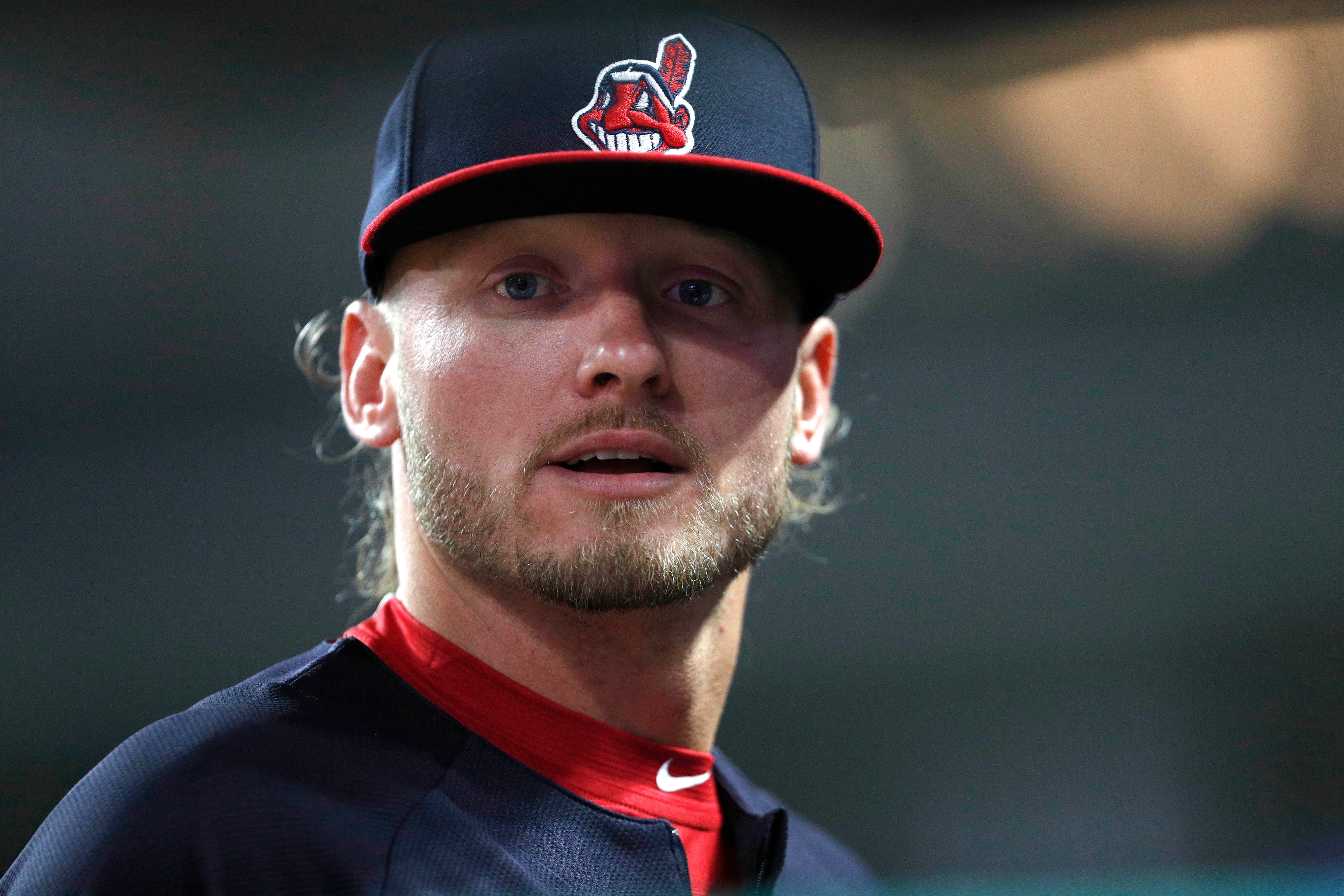 Sep 1, 2018; Cleveland, OH, USA; Cleveland Indians third baseman Josh Donaldson (20) looks on from the dugout during the seventh inning against the Tampa Bay Rays at Progressive Field. Mandatory Credit: Raj Mehta-USA TODAY Sports / Raj Mehta