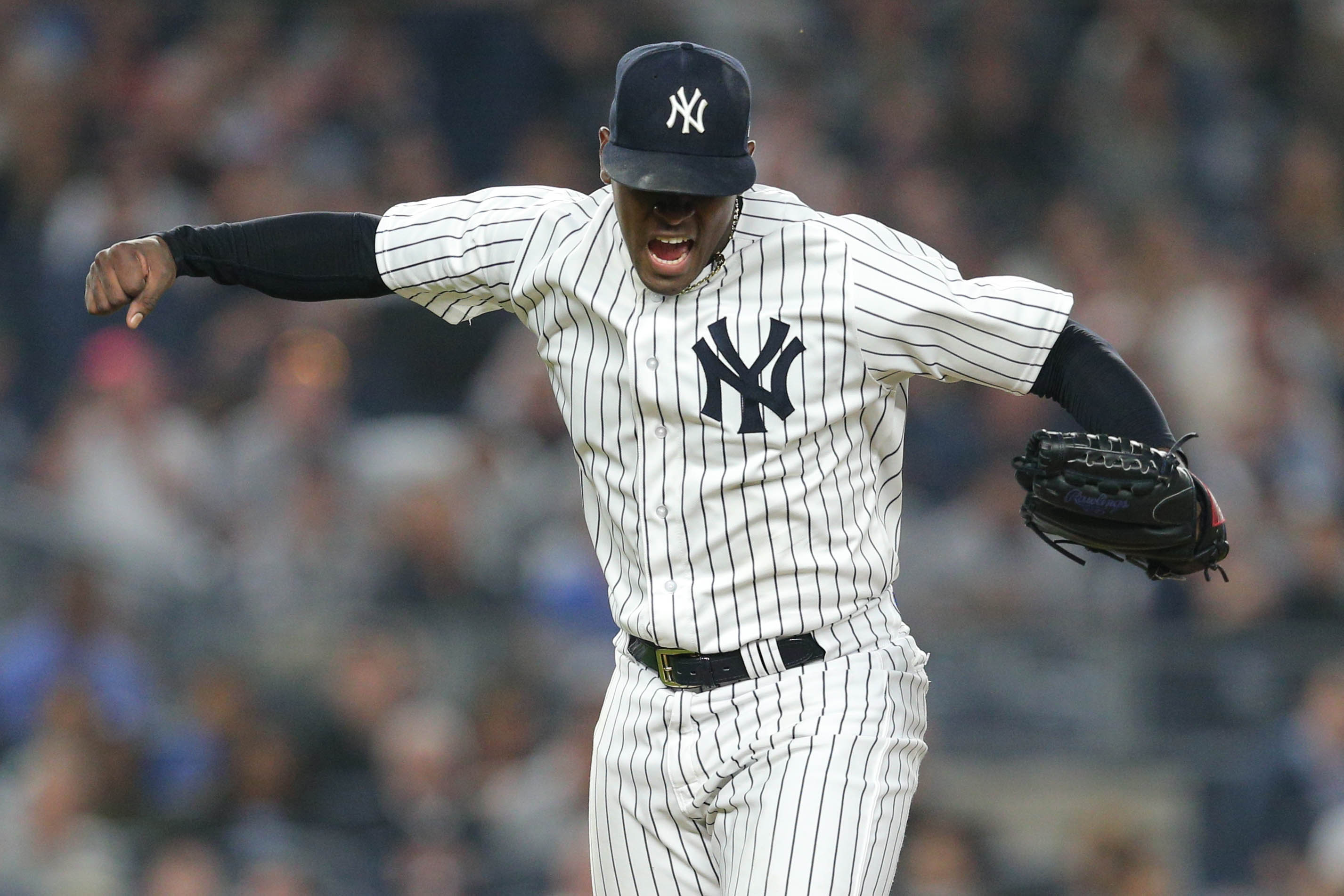 May 30, 2018; Bronx, NY, USA; New York Yankees starting pitcher Luis Severino (40) reacts after the top of the seventh inning against the Houston Astros at Yankee Stadium. Mandatory Credit: Brad Penner-USA TODAY Sports / Brad Penner