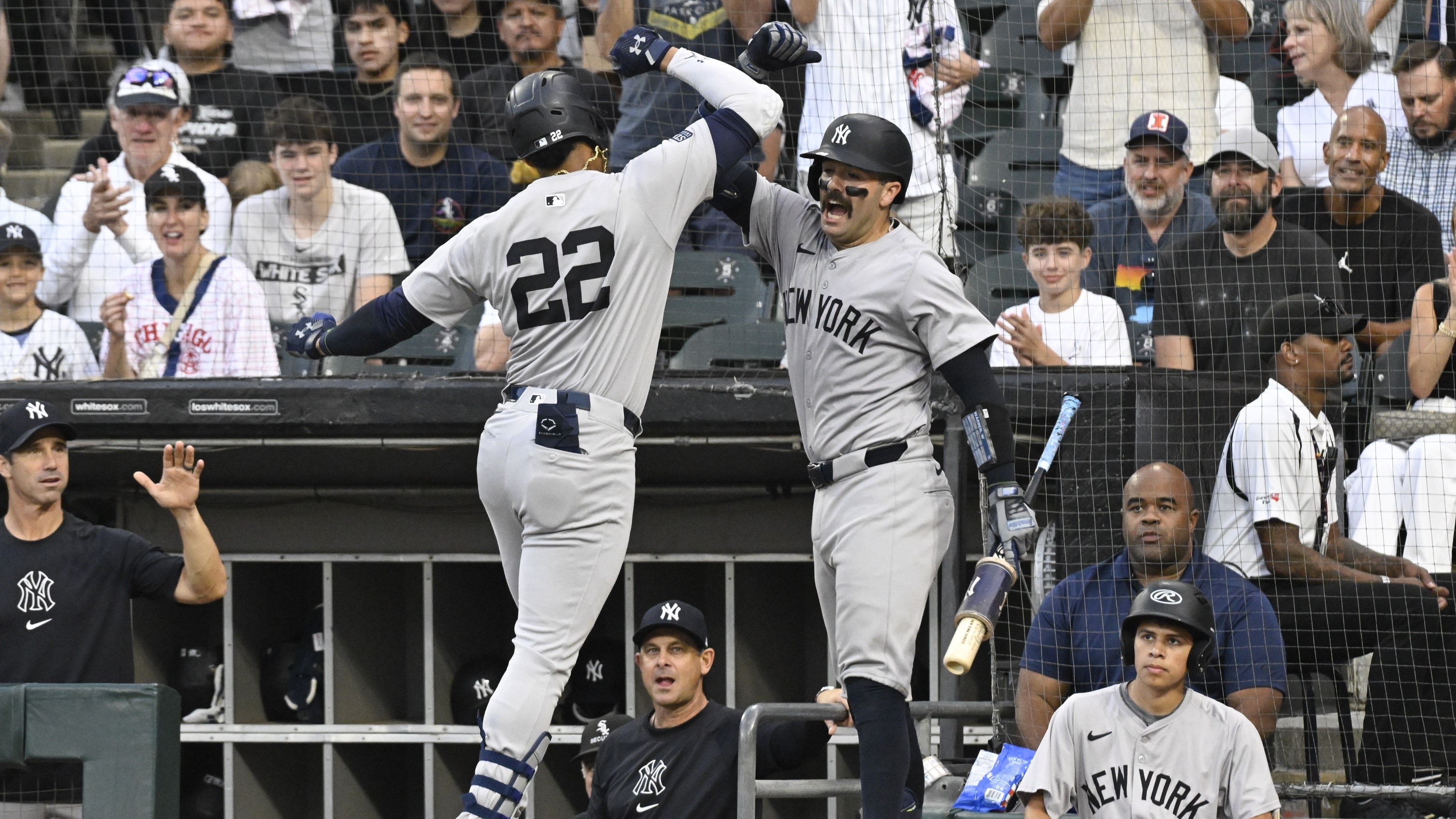Aug 14, 2024; Chicago, Illinois, USA; New York Yankees outfielder Juan Soto (22) celebrates with catcher Austin Wells (28) after he hit a home run against the Chicago White Sox during the first inning at Guaranteed Rate Field. / Matt Marton-USA TODAY Sports
