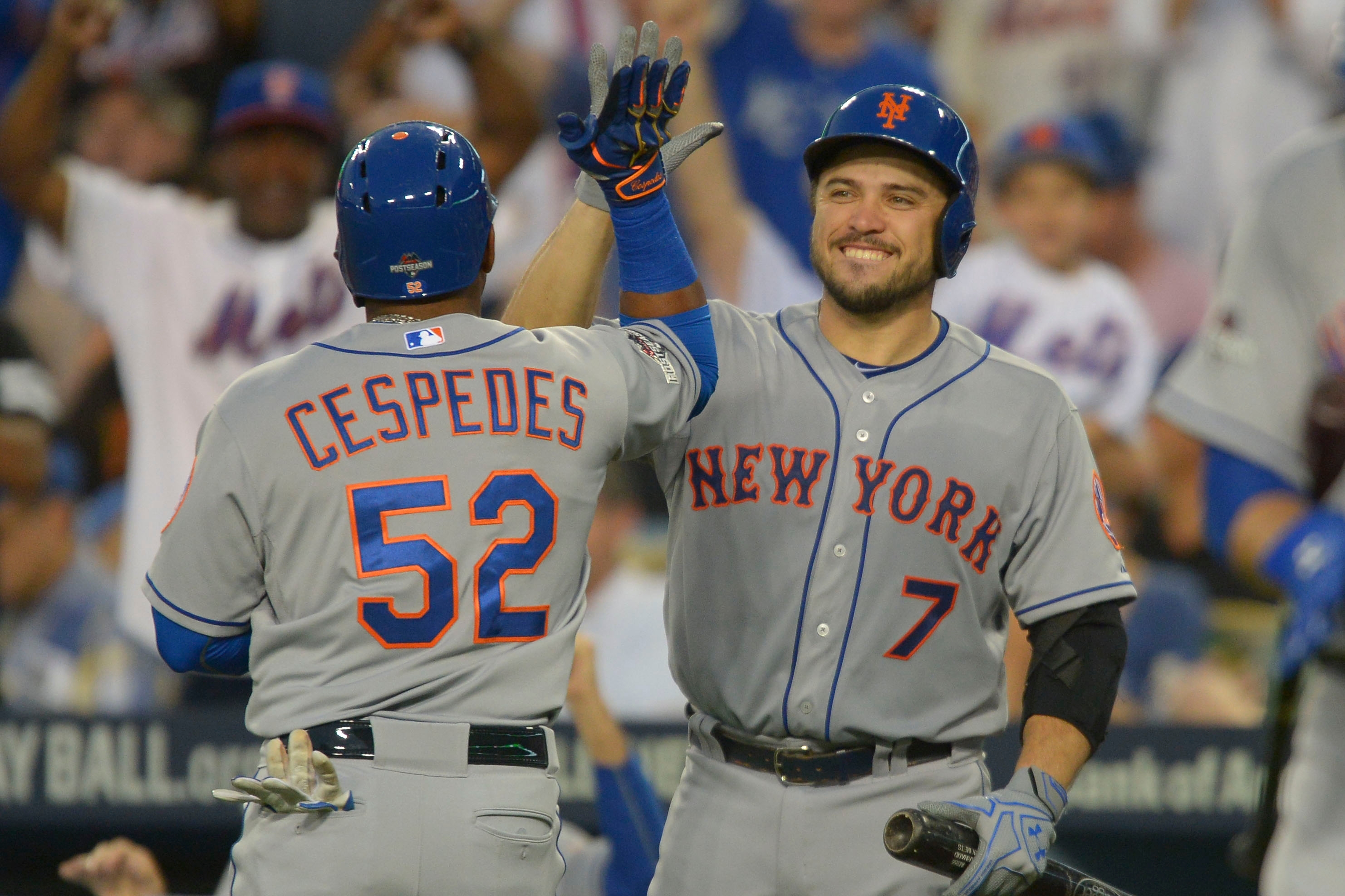 Oct 10, 2015; Los Angeles, CA, USA; New York Mets center fielder Yoenis Cespedes (52) is congratulated by catcher Travis d'Arnaud (7) for hitting a solo home run during the second inning in game two of the NLDS against the Los Angeles Dodgers at Dodger Stadium. Mandatory Credit: Jayne Kamin-Oncea-USA TODAY Sports / Jayne Kamin-Oncea