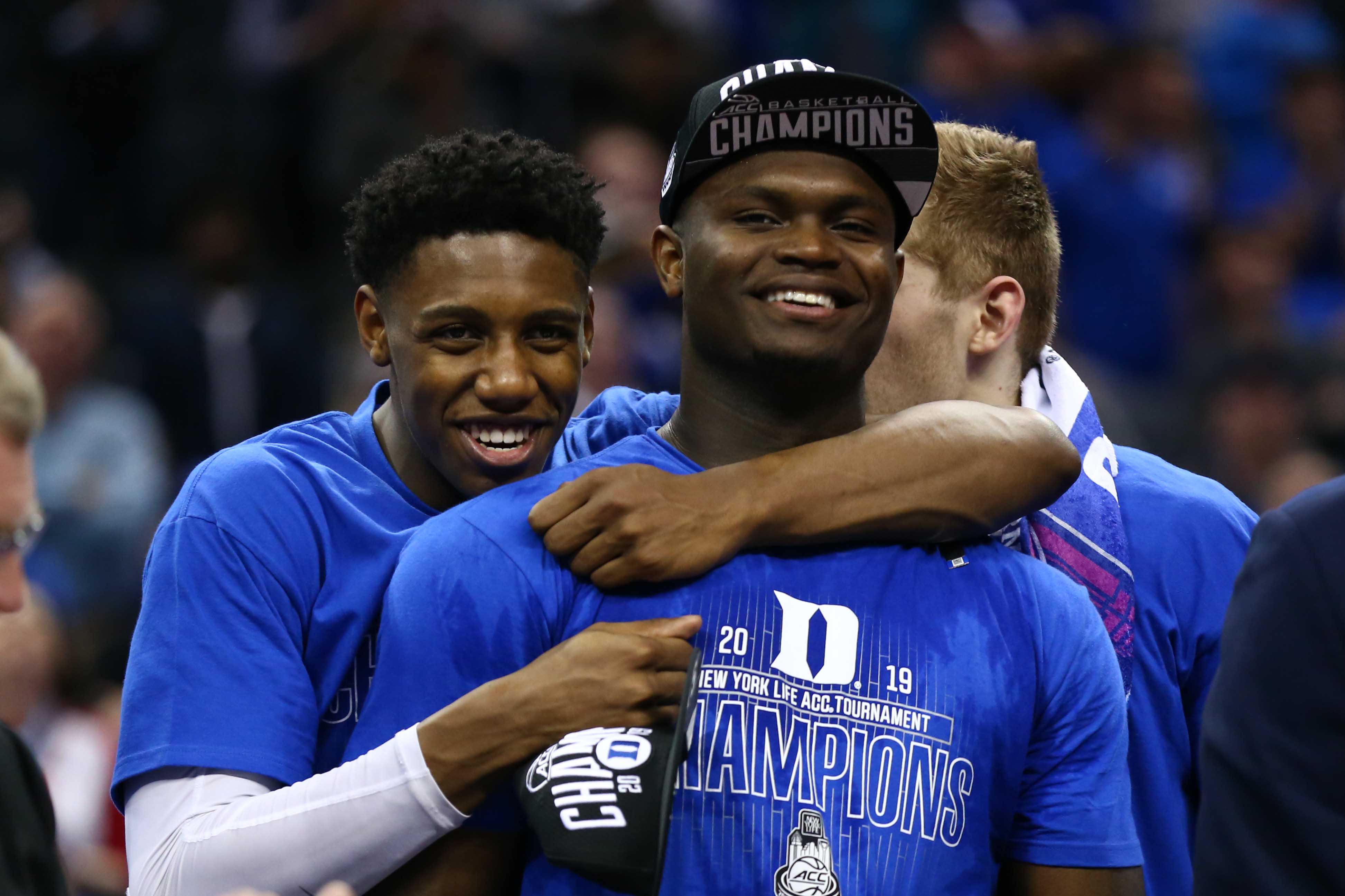 Mar 16, 2019; Charlotte, NC, USA; Duke Blue Devils forward RJ Barrett (5) hugs forward Zion Williamson (1) after defeating the Florida State Seminoles in the ACC conference tournament at Spectrum Center. Mandatory Credit: Jeremy Brevard-USA TODAY Sports / Jeremy Brevard